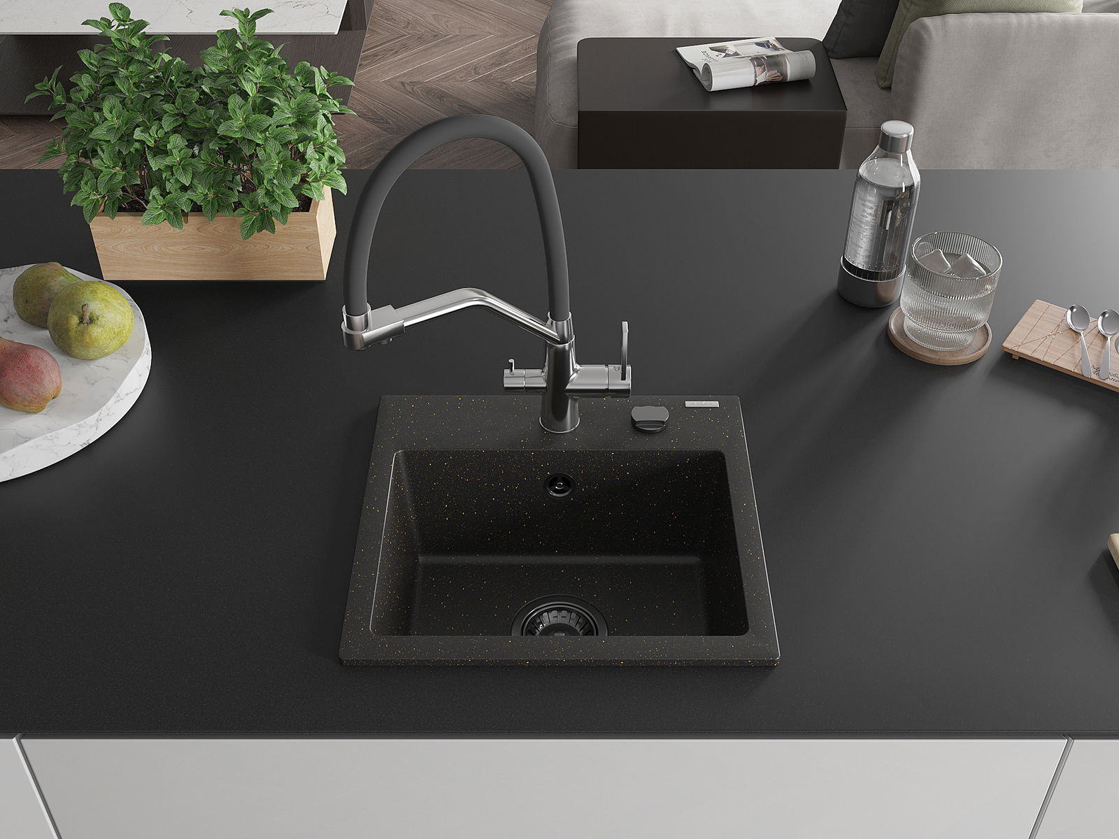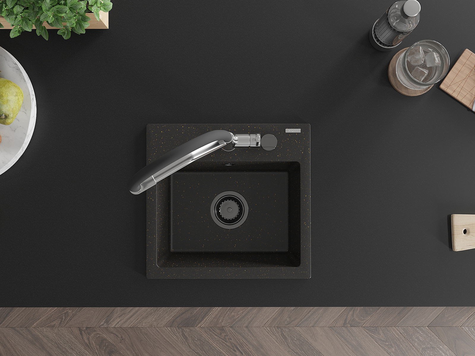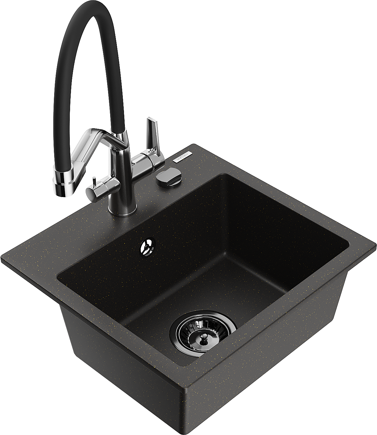 Mexen Milo granīta izlietne ar 1 kameru un virtuves jaucējkrānu Duo, melns/zeltītu metālisku - 6505-75-671701-07-B