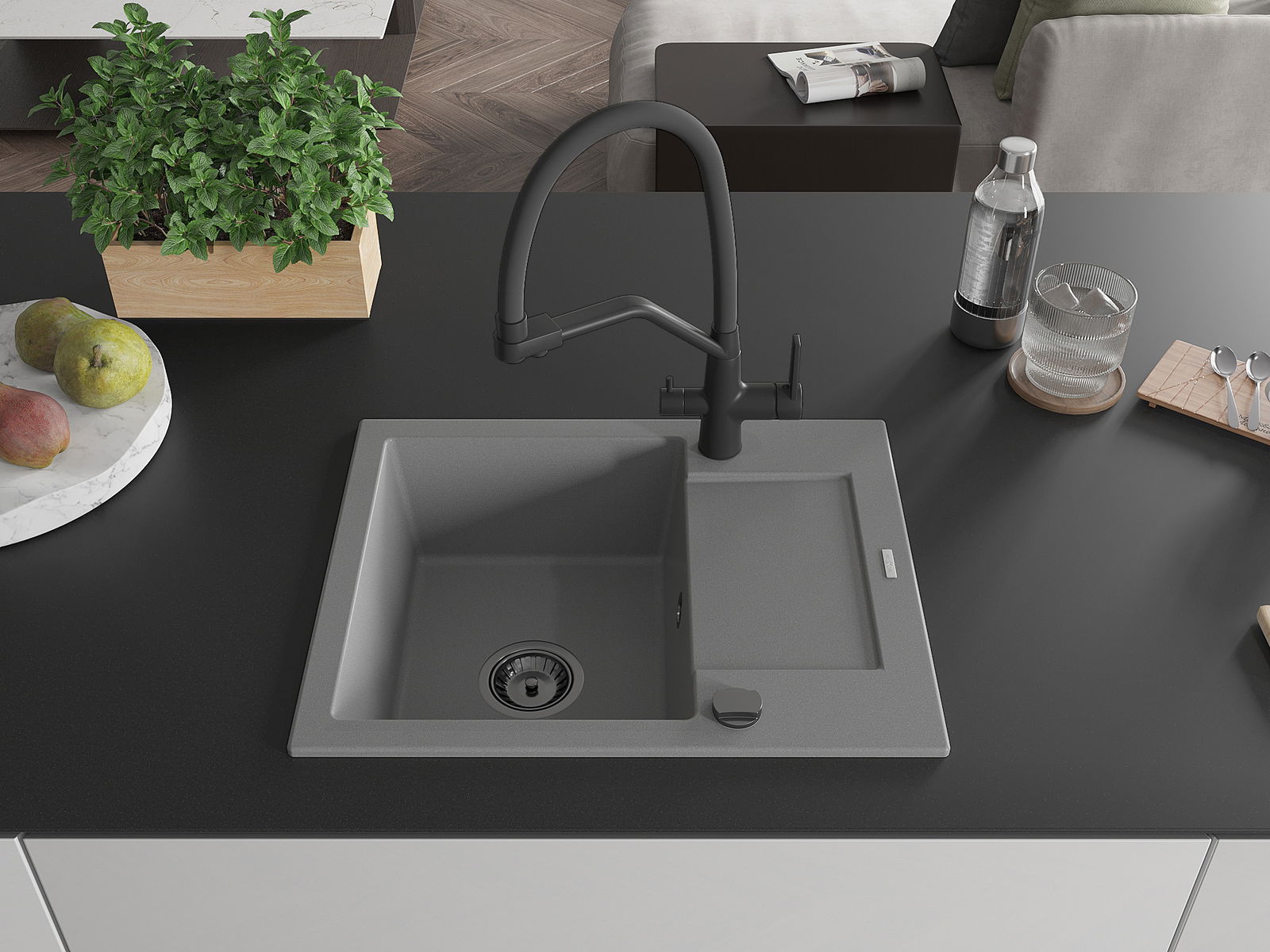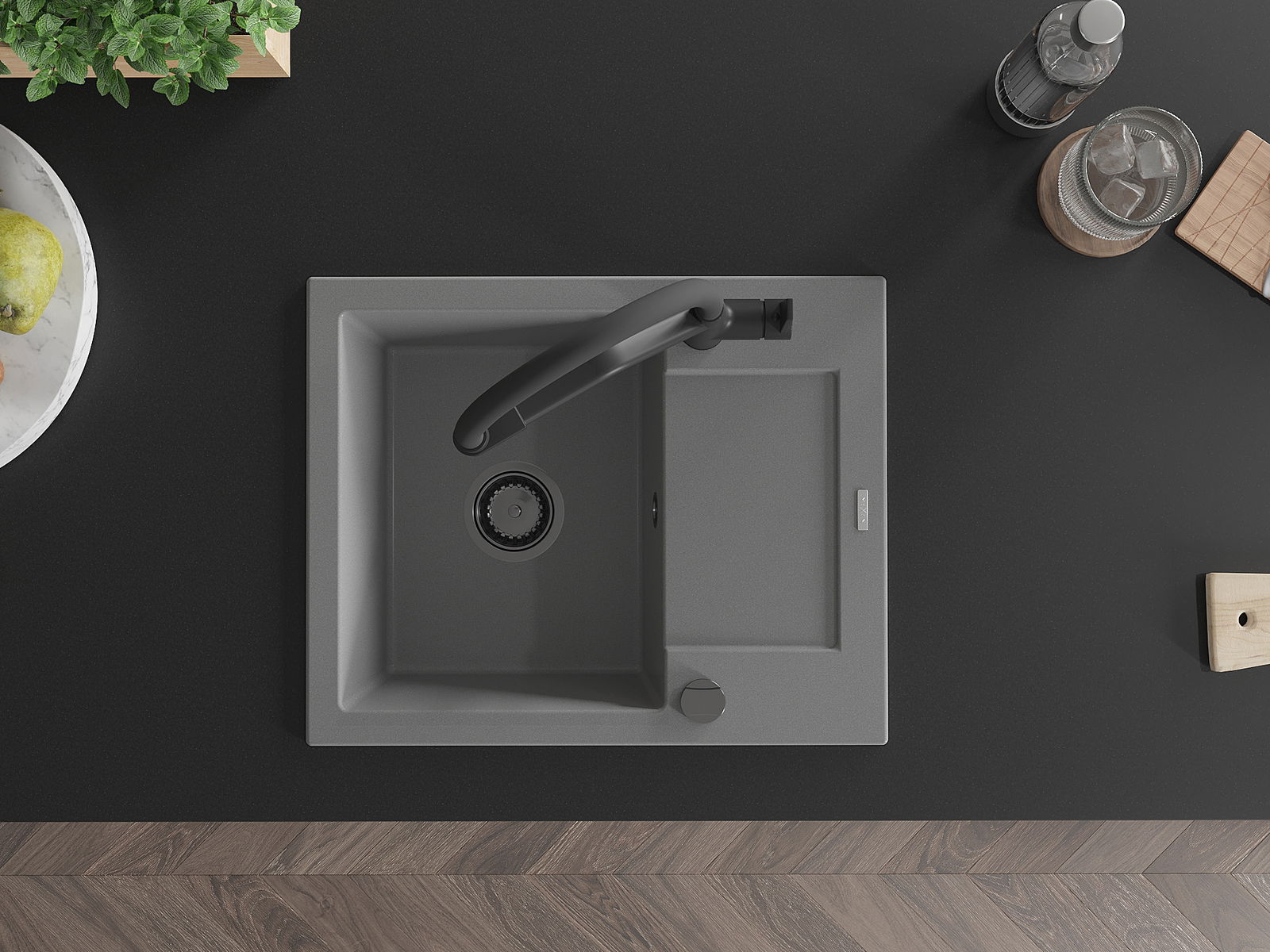 Mexen Enzo granīta izlietne ar vienu nodalījumu un notekas un virtuves jaucējkrānu Duo, pelēka - 6506-71-671701-70-B
