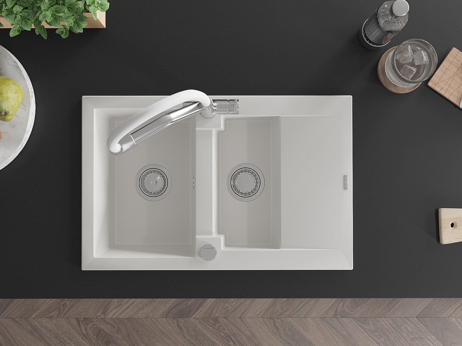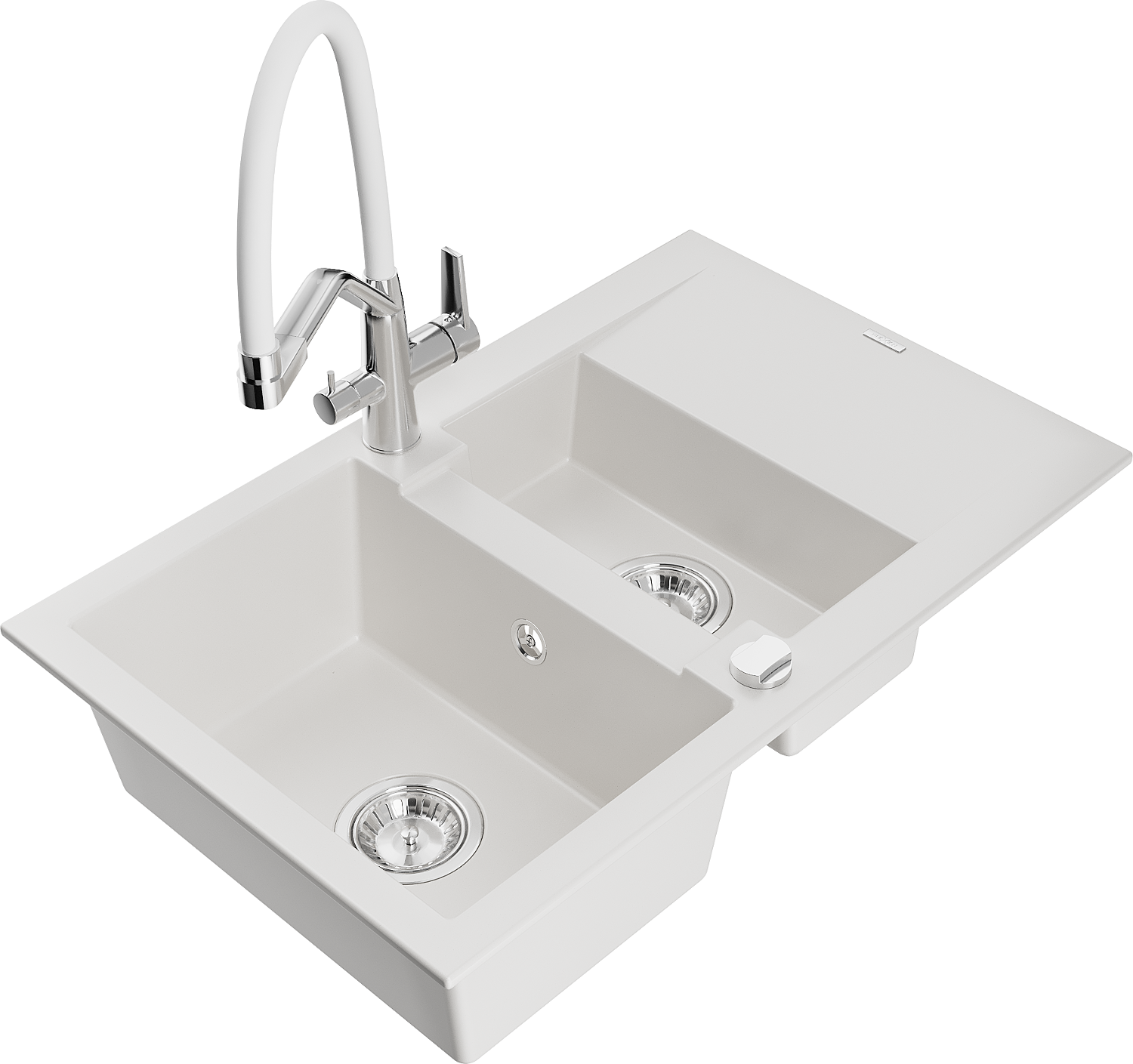 Mexen Gaspar granīta izlietne ar 1,5 kamerām, noteku un virtuves jaucējkrānu Duo, balta - 6507-20-671701-02