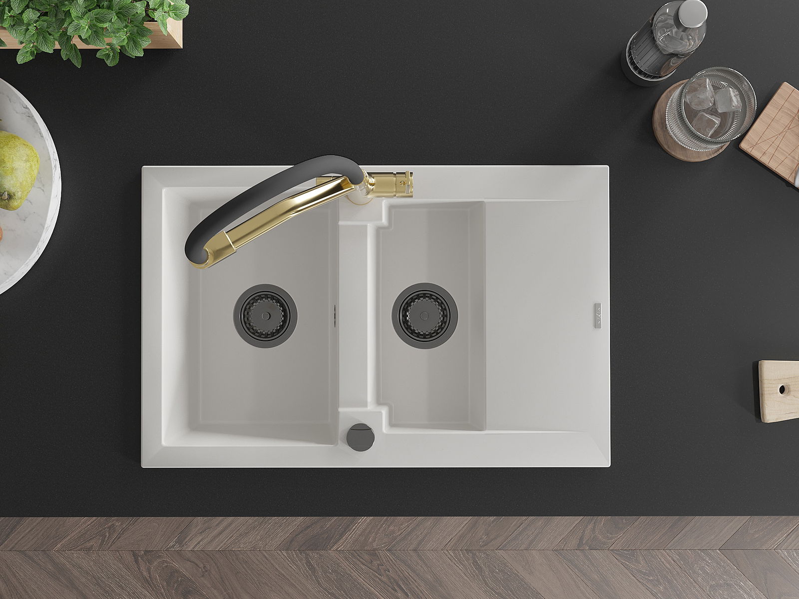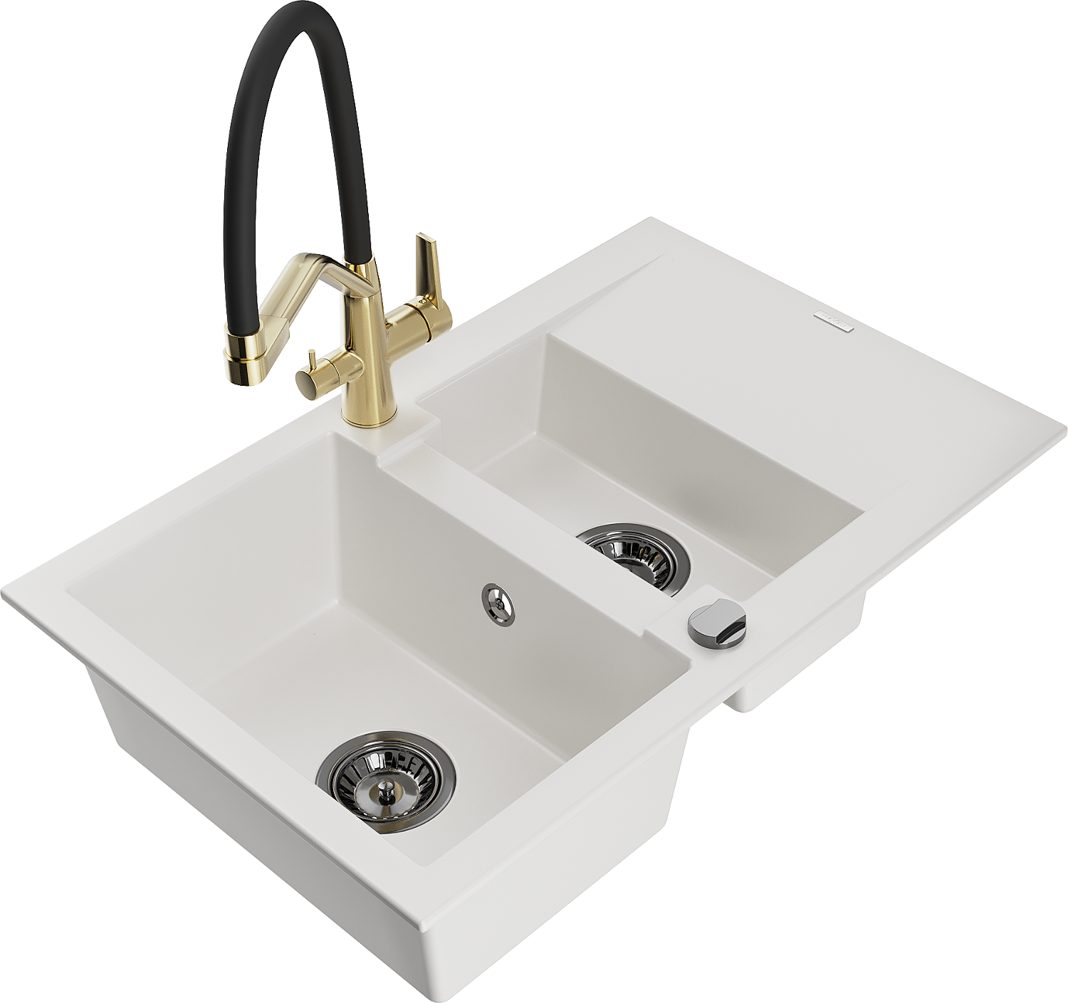 Mexen Gaspar granīta izlietne ar 1,5 nodalījumiem un noteku plauktu un virtuves jaucējkrānu Duo, balta - 6507-20-671701-57-B