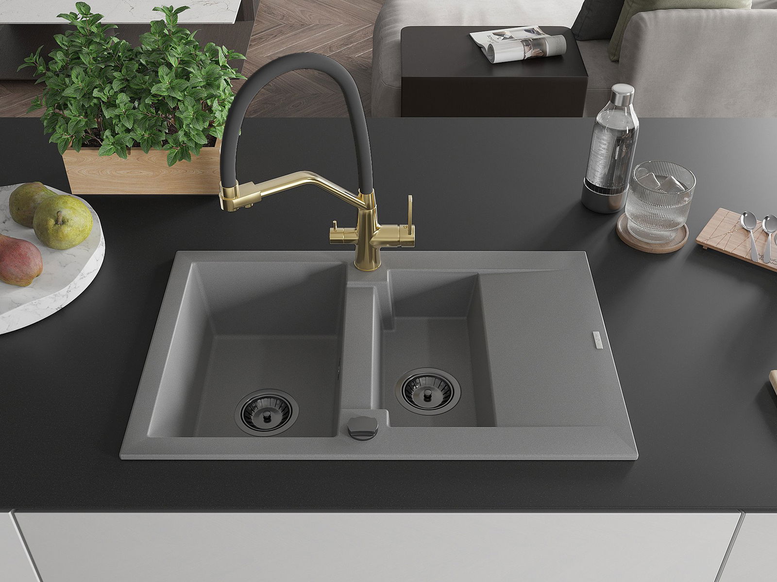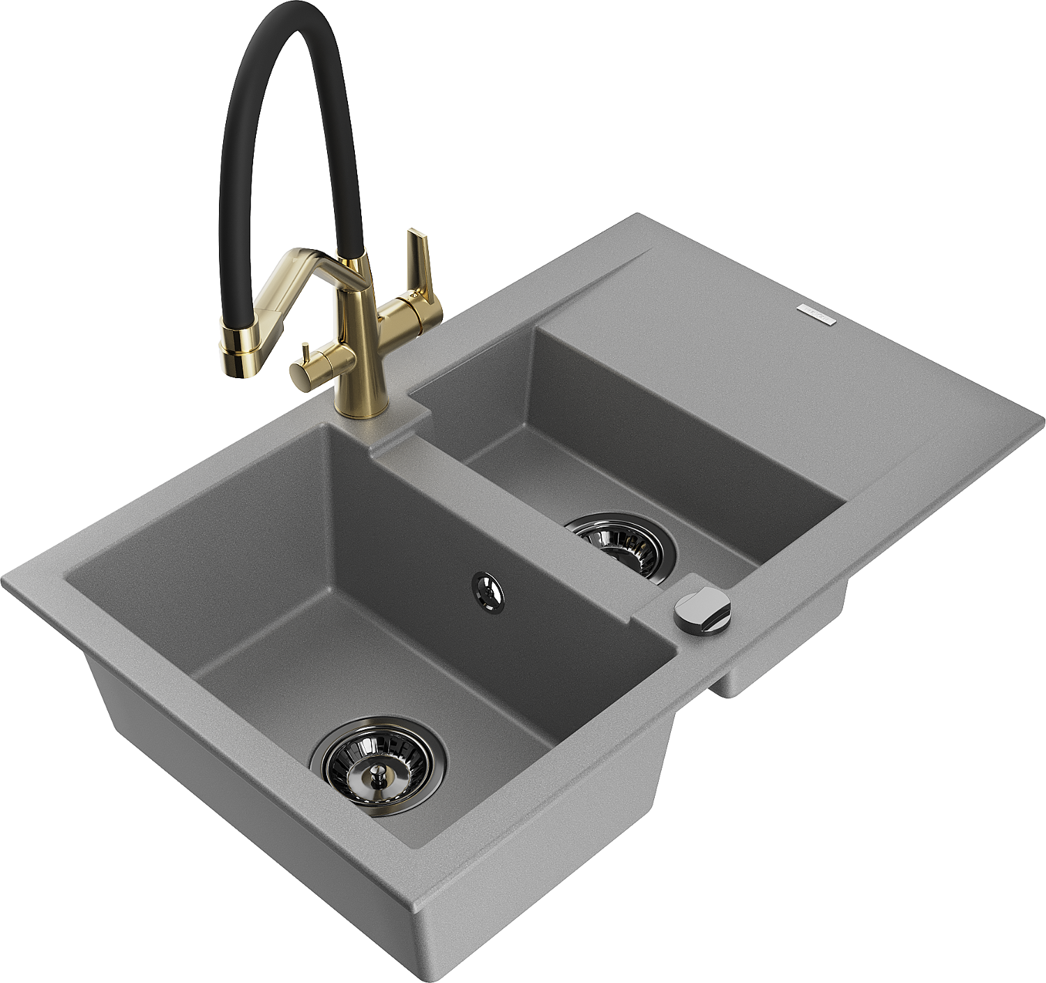 Mexen Gaspar granitizlietne ar vienu un pusi kameru, ar noteces trauku un divu krānu, pelēks - 6507-71-671701-57-B
