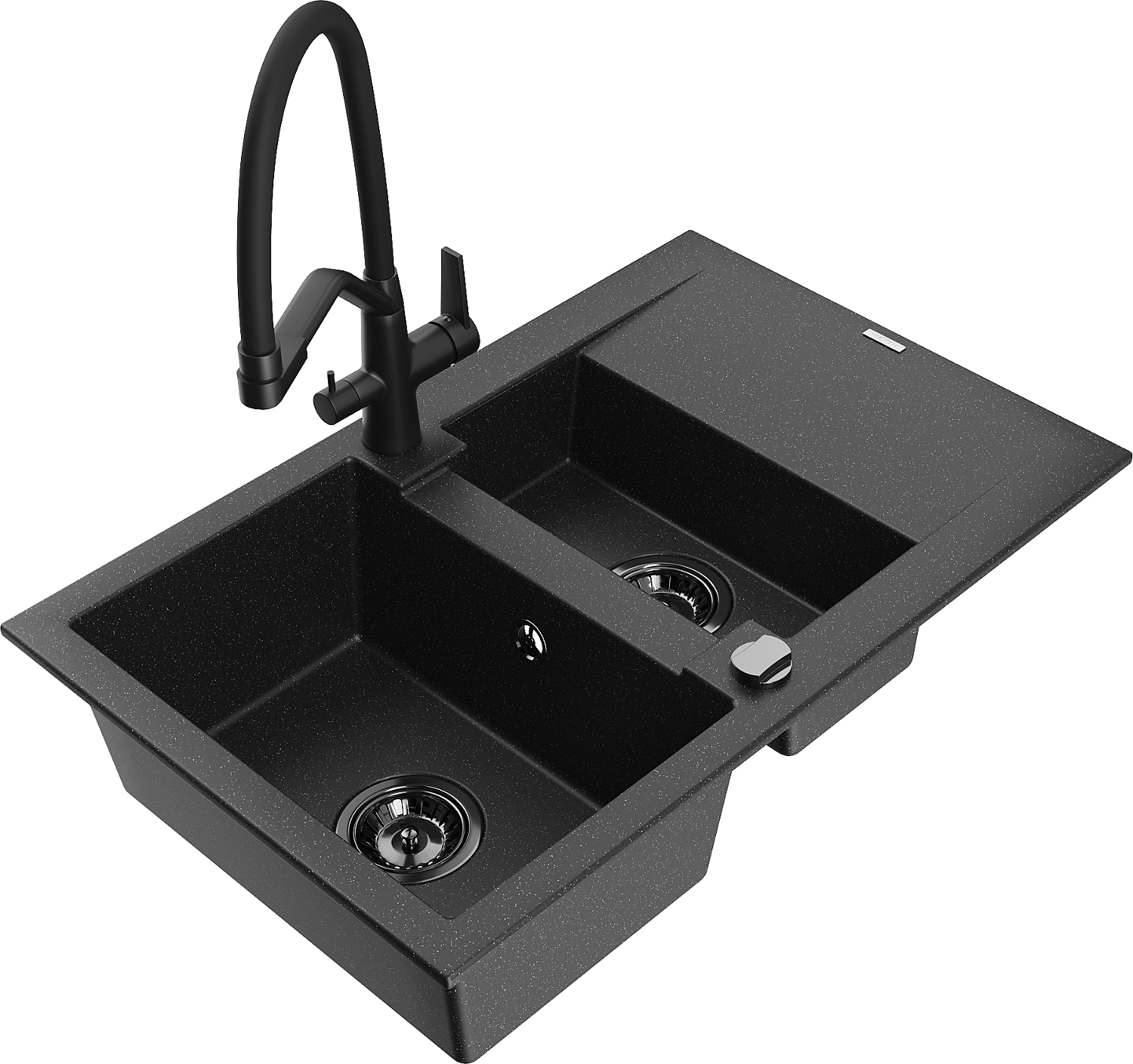 Mexen Gaspar granīta izlietne 1,5 nodalījumu ar noteces paneli un virtuves jaucējkrānu Duo, melna/sudraba - 6507-73-671701-70-B