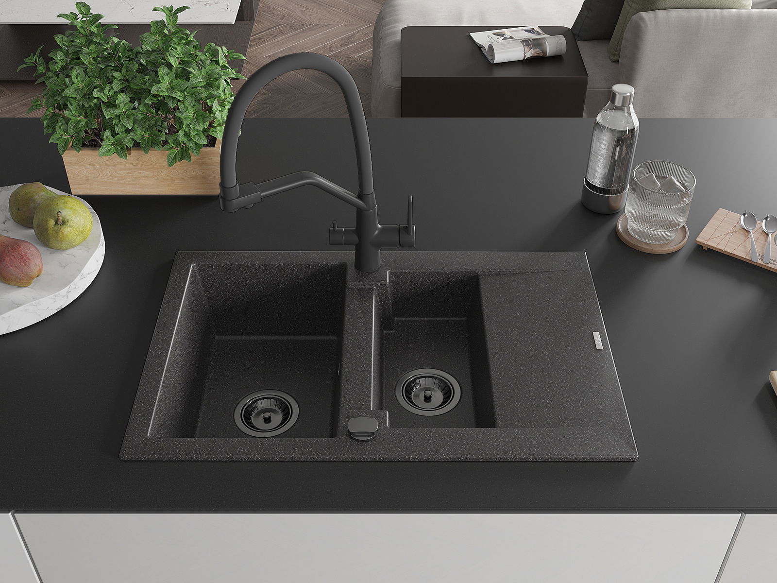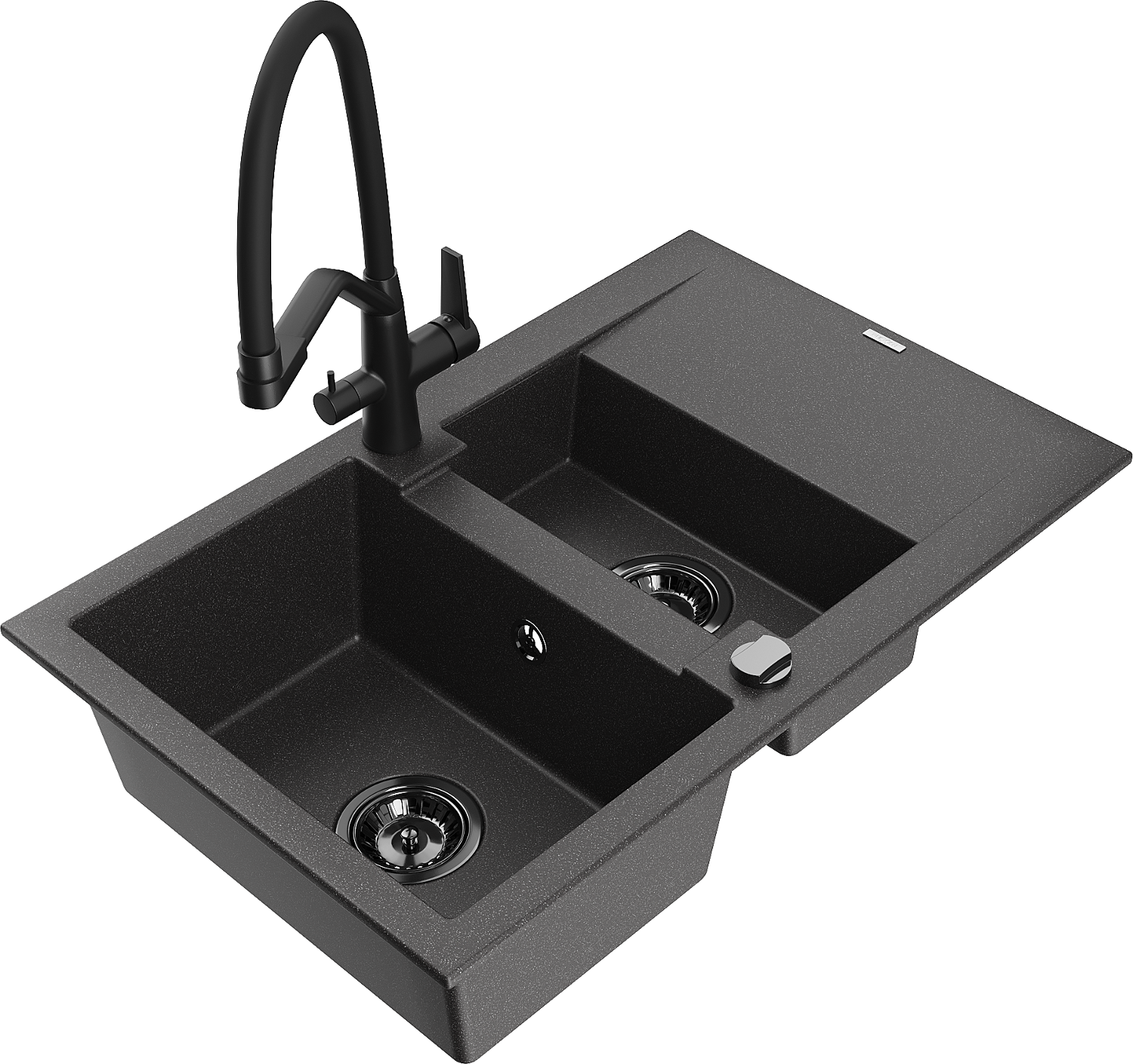 Mexen Gaspar granitizlietne izlietne ar 1,5 nodalījumiem un noteku un virtuves jaucējkrānu Duo, melna ar plankumiem