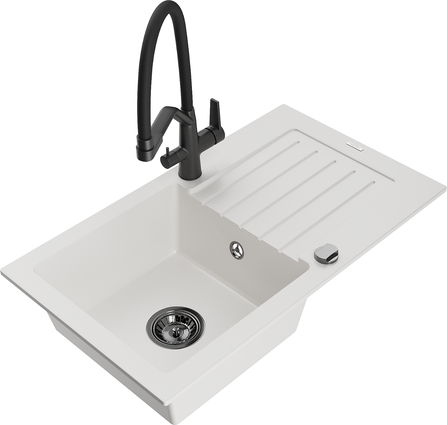 Mexen Pablo granīta izlietne ar 1 nodalījumu un notekas platu un virtuves jaucējkrānu Duo, balts - 6510-20-671701-70-B