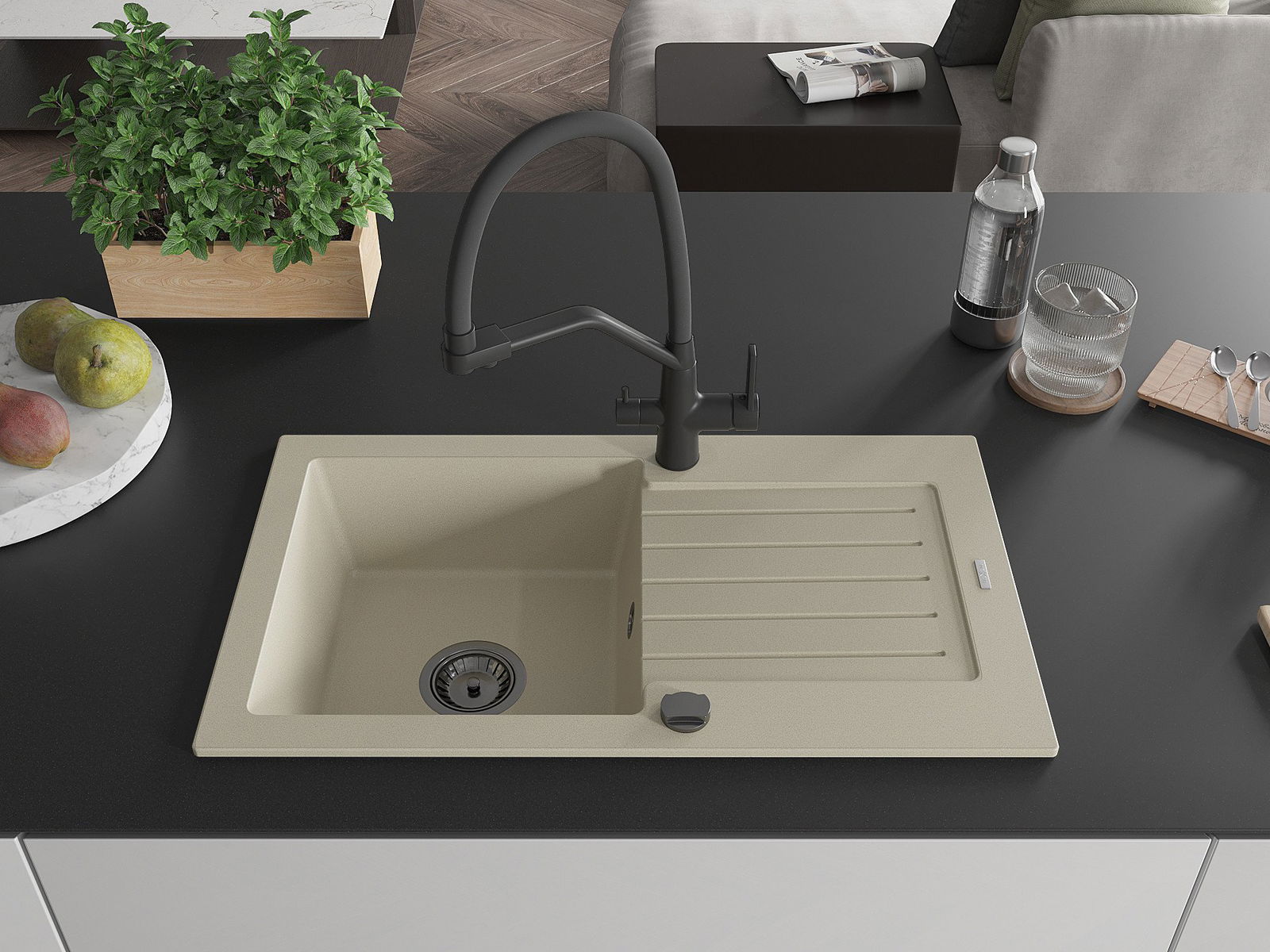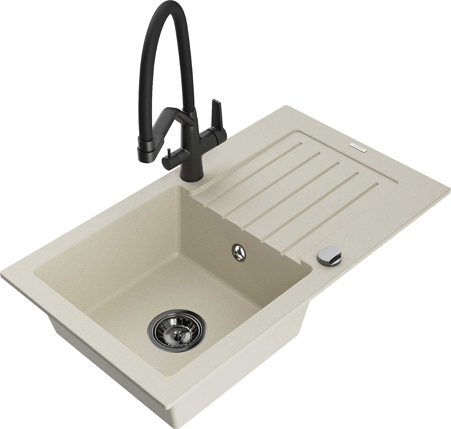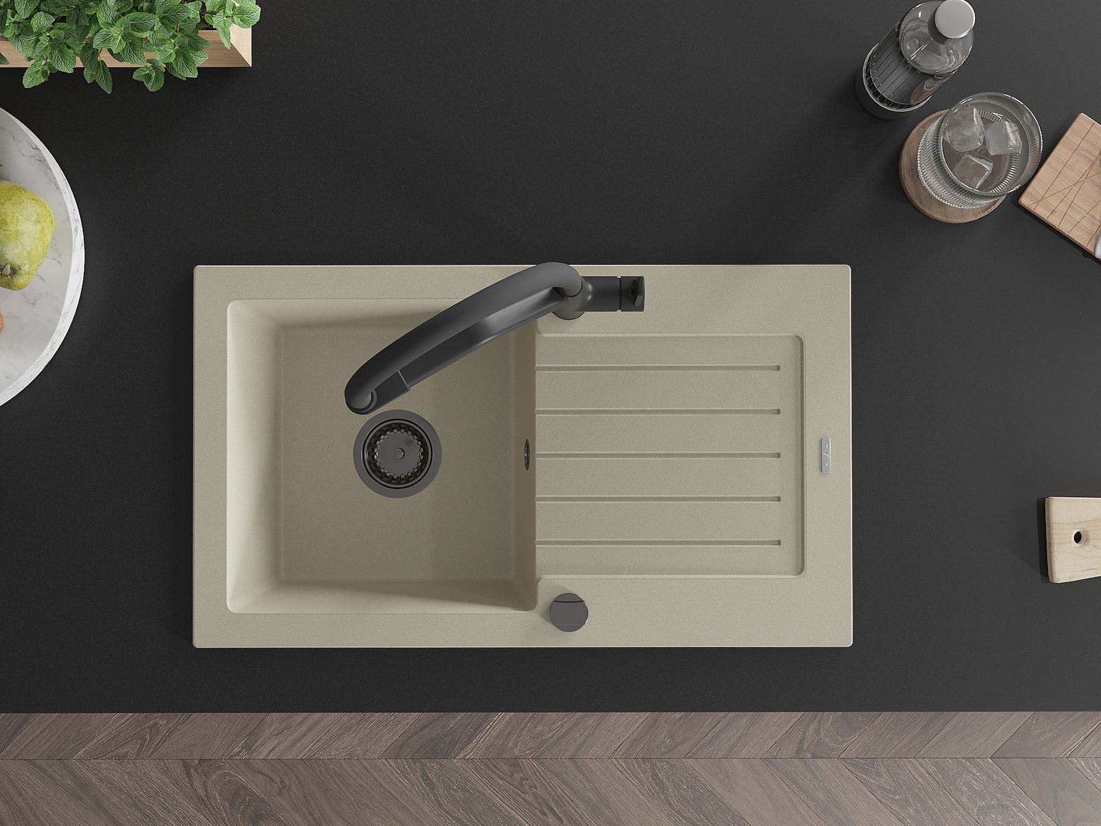 Mexen Pablo granit izlietne ar vienu nodalījumu, noteces plāksni un virtuves jaucējkrānu Duo, bēša - 6510-69-671701-70-B
