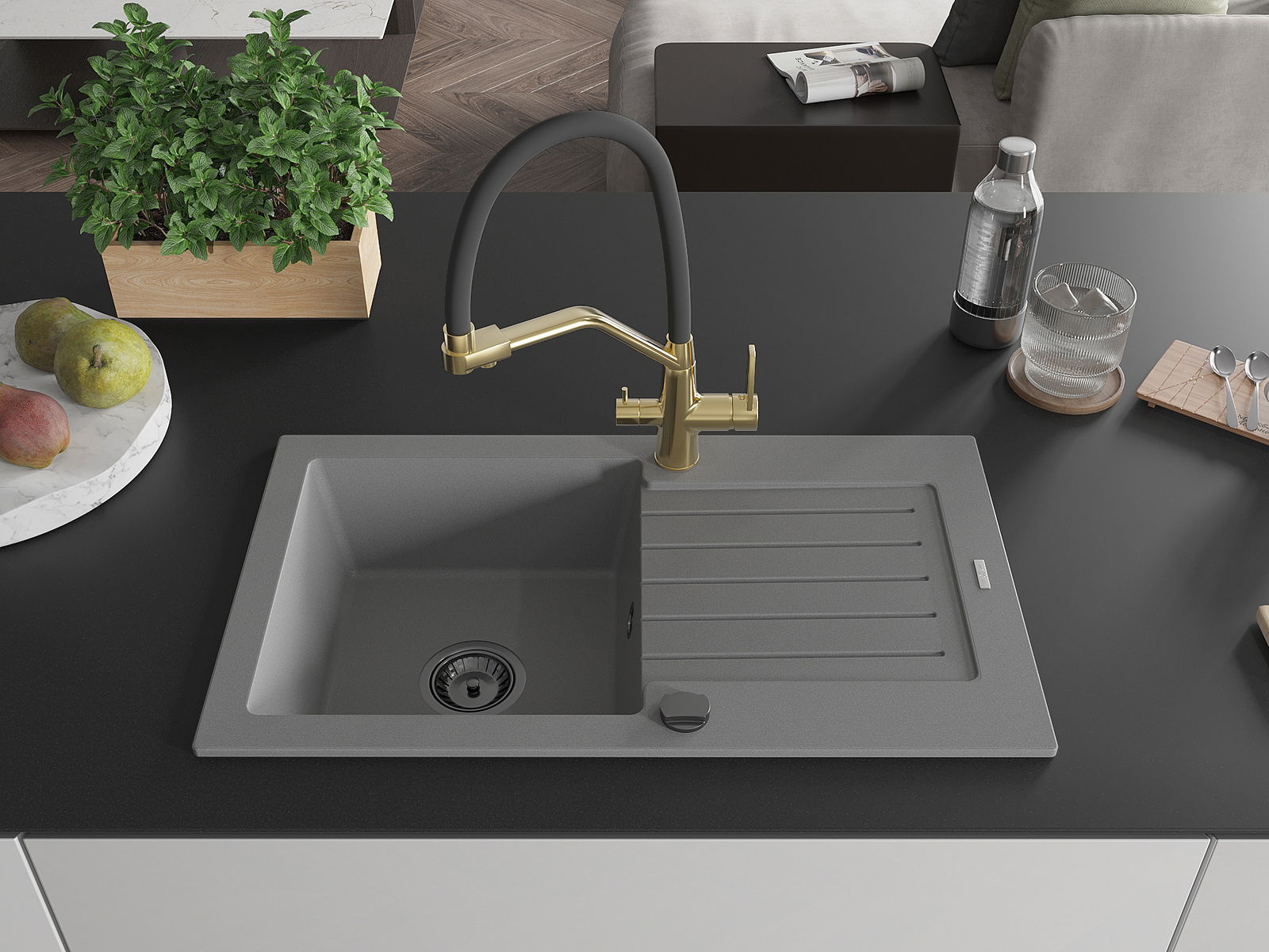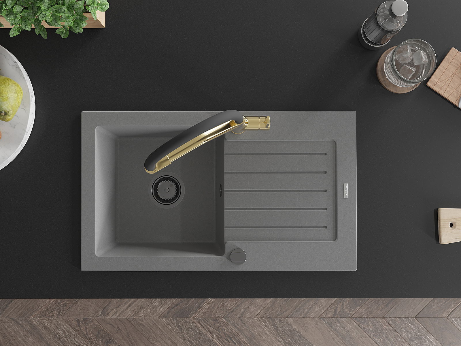 Mexen Pablo granīta izlietne ar vienu nodalījumu, notekas un virtuves jaucējkrāns Duo, pelēka - 6510-71-671701-57-B