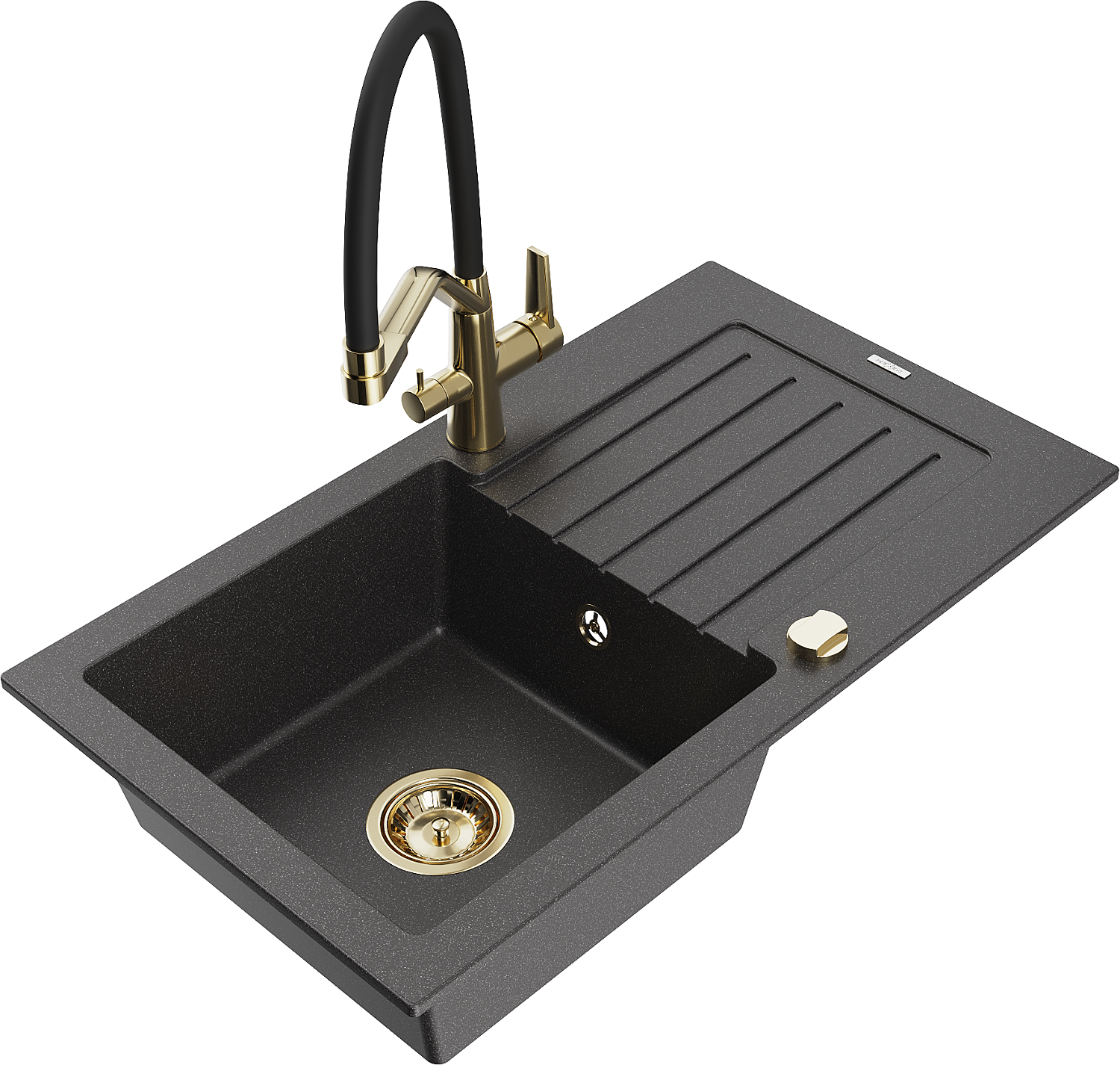 Mexen Pablo granitizlietne ar vienu nodalījumu ar notecētāju un virtuves krānu Duo, melna ar plankumiem