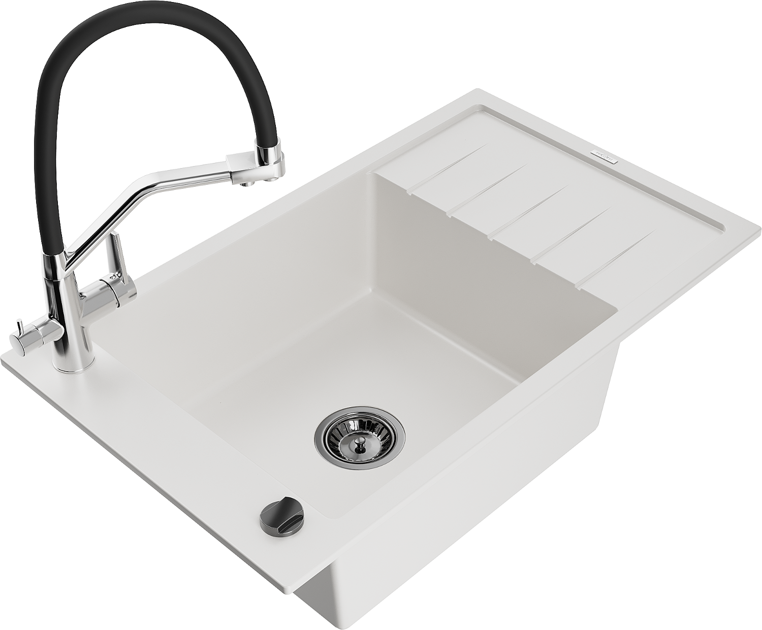 Mexen Elias granit izlietne ar vienu nodalījumu un noteces zonu, un virtuves jaucējkrānu Duo, balta - 6511-20-671701-07-B