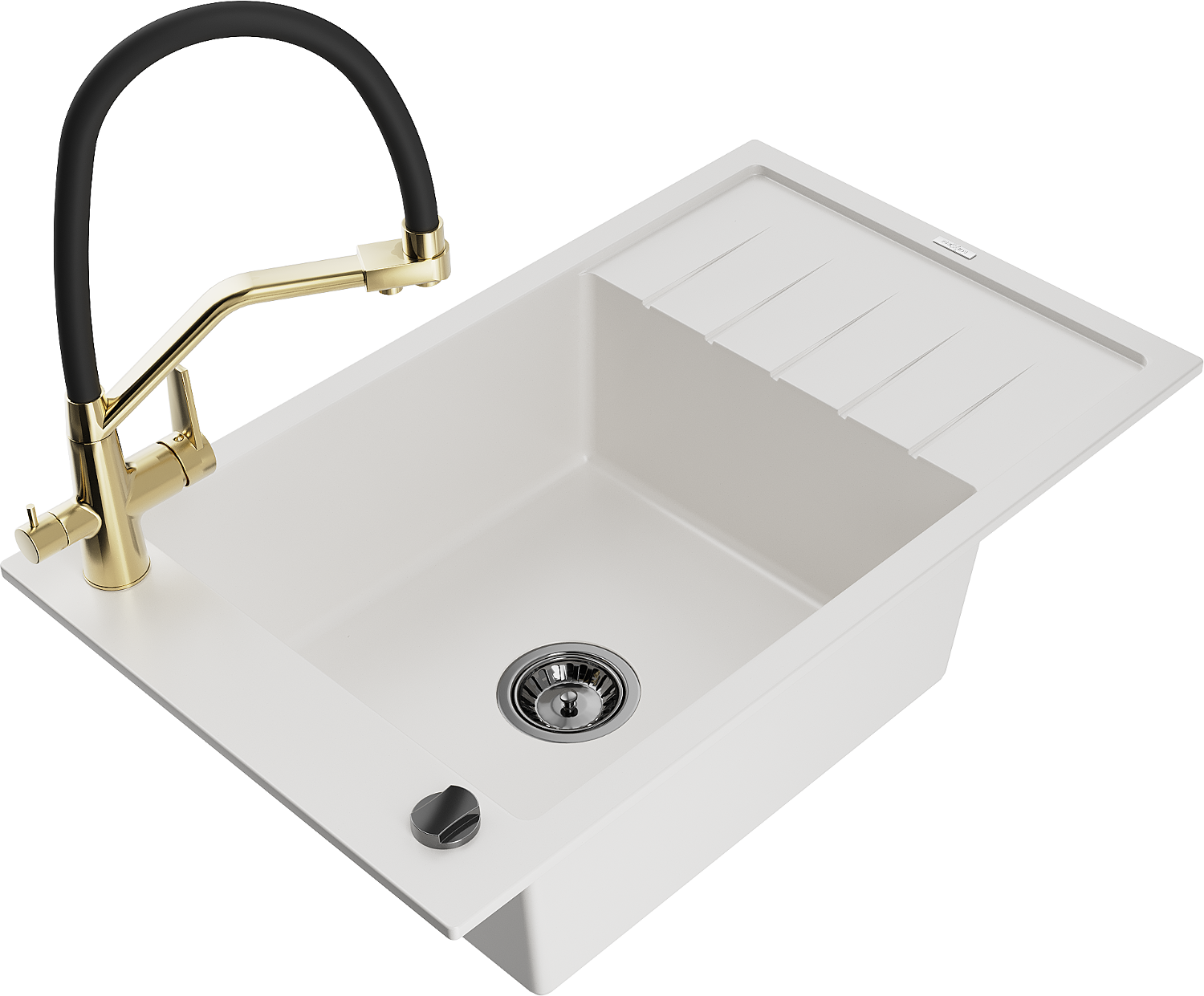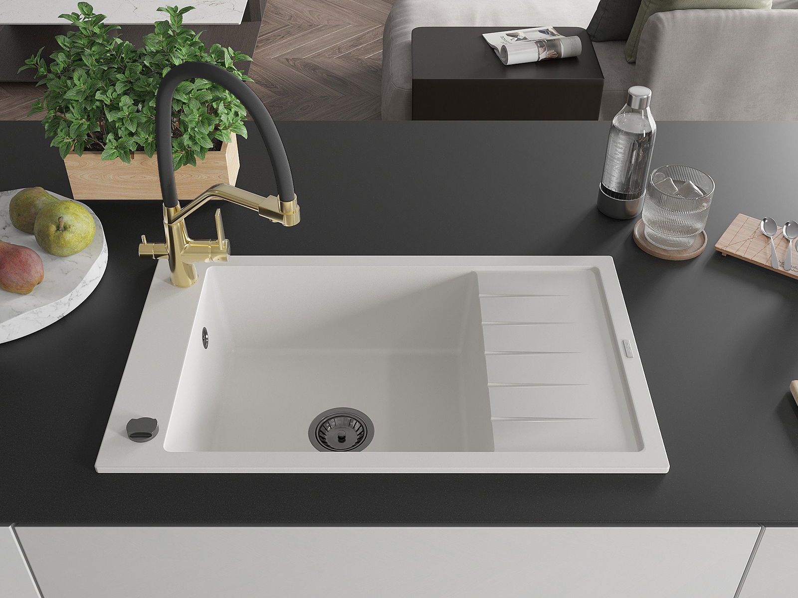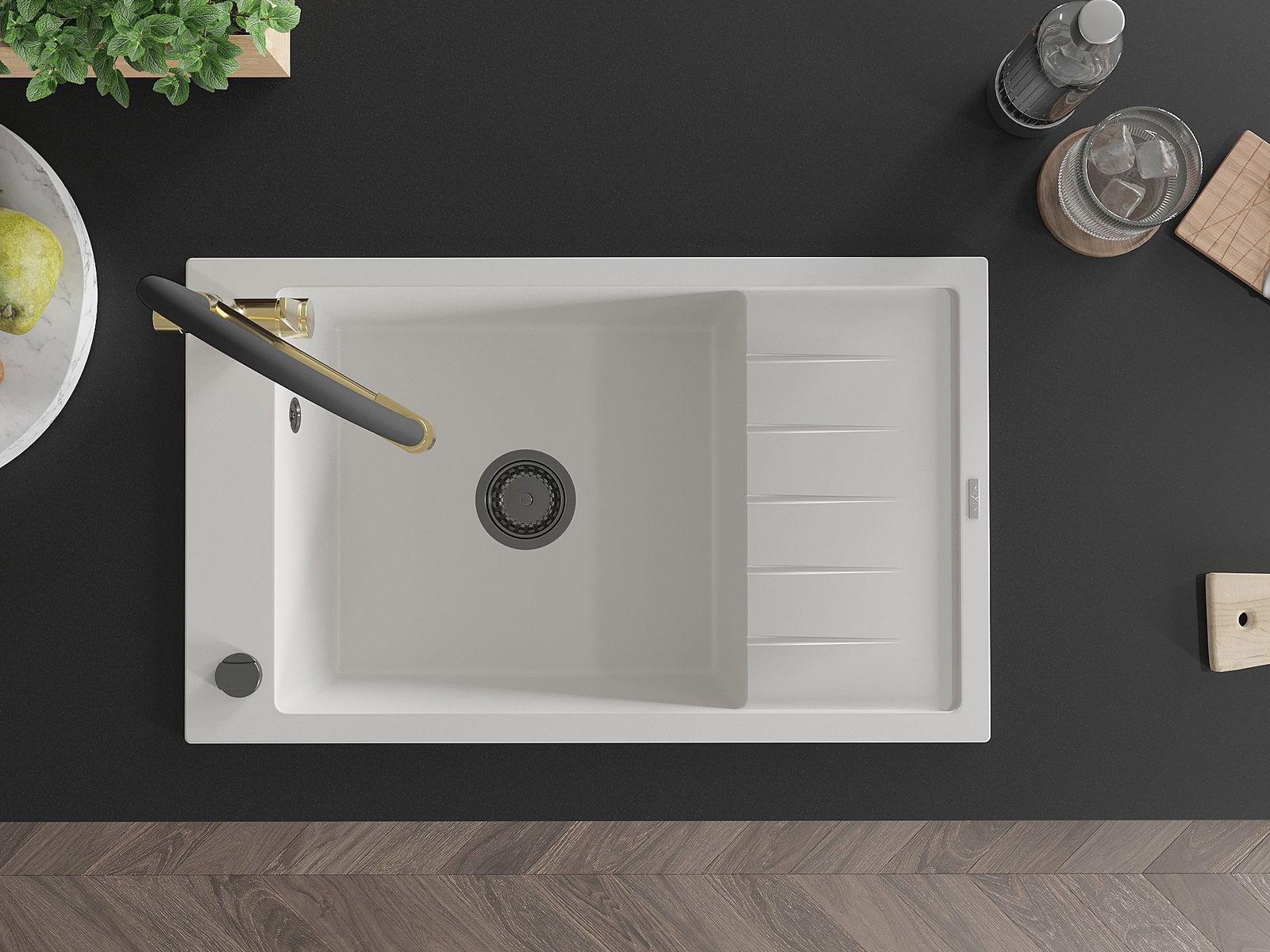 Mexen Elias granitizlietne ar vienu nodalījumu un notekas reni, ar virtuves jaucējkrānu Duo, balts - 6511-20-671701-57-B