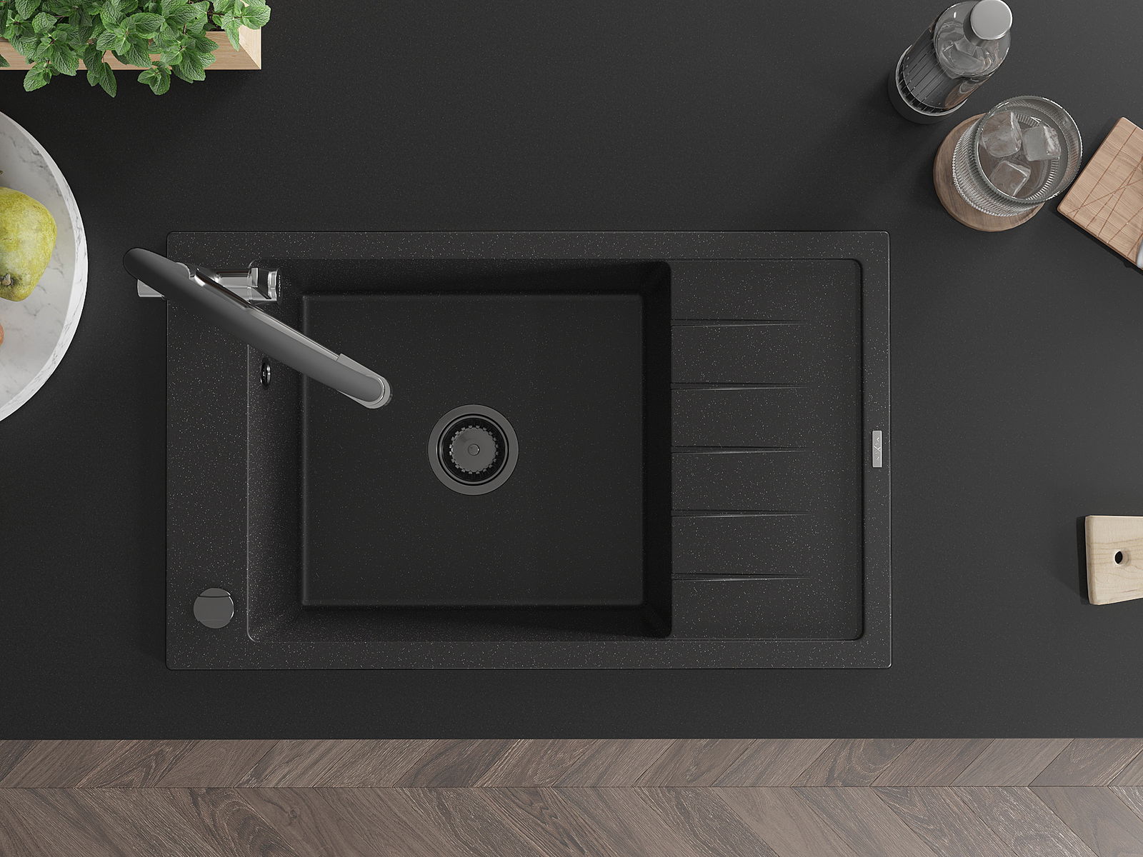 Mexen Elias Granitā izlietne ar vienu nodalījumu, notecinātāju un virtuves jaucējkrānu Duo, melns/sudraba metālisks