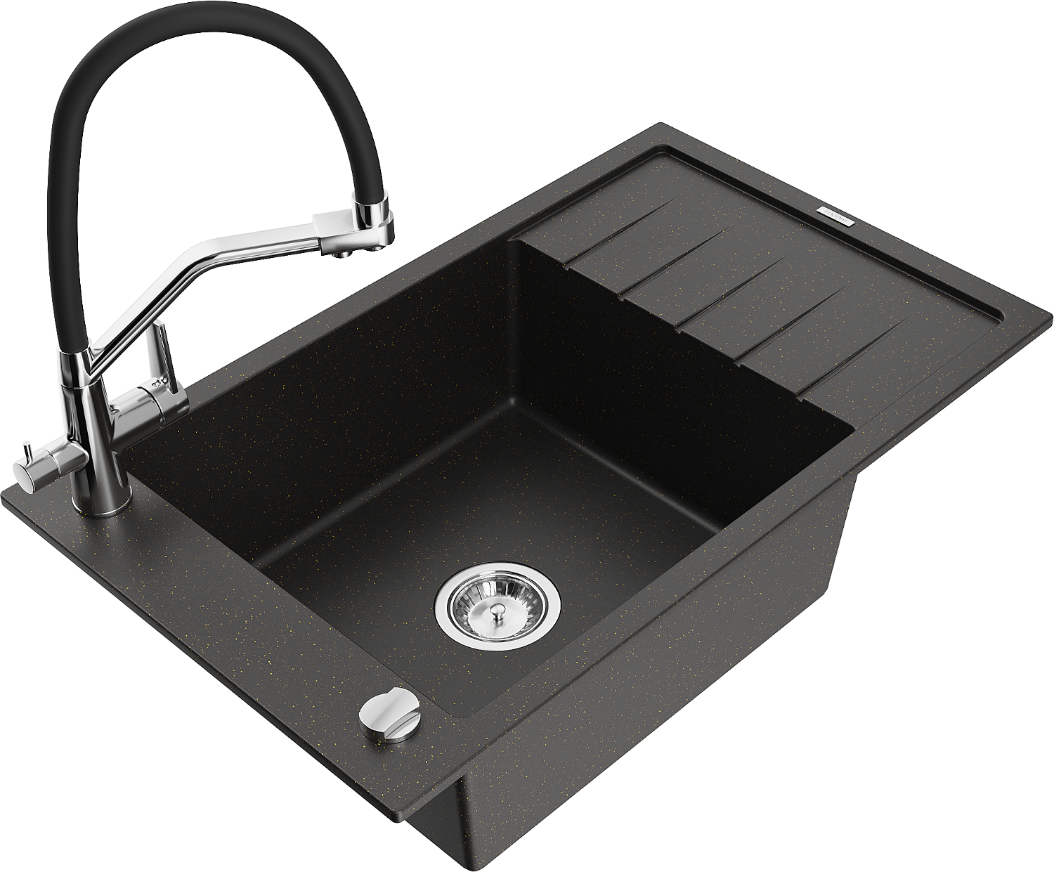 Mexen Elias vienas sists granīta izlietne ar noteci un virtuves jaucējkrānu Duo, melns/zelta metāliks - 6511-75-671701-07