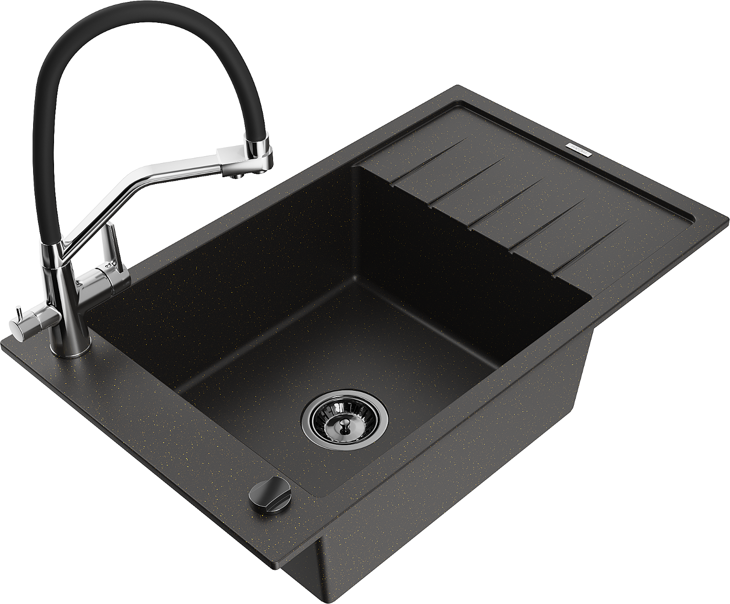 Mexen Elias granīta izlietne ar vienu nodalījumu, ar notecētavu un virtuves jaucējkrānu Duo, melns/zeltains metālisks