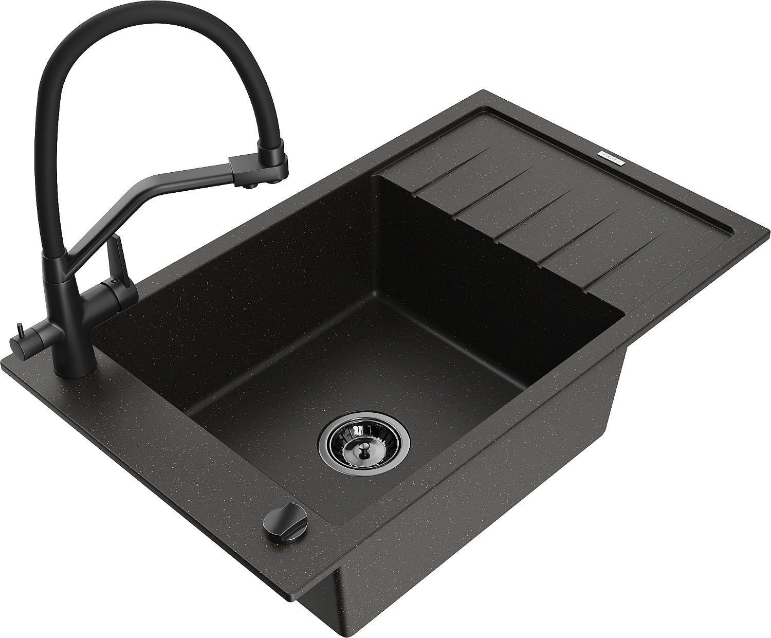 Mexen Elias granīta izlietne ar vienu nodalījumu, noteces zonu un virtuves jaucējkrānu Duo, melns/zeltains metālisks