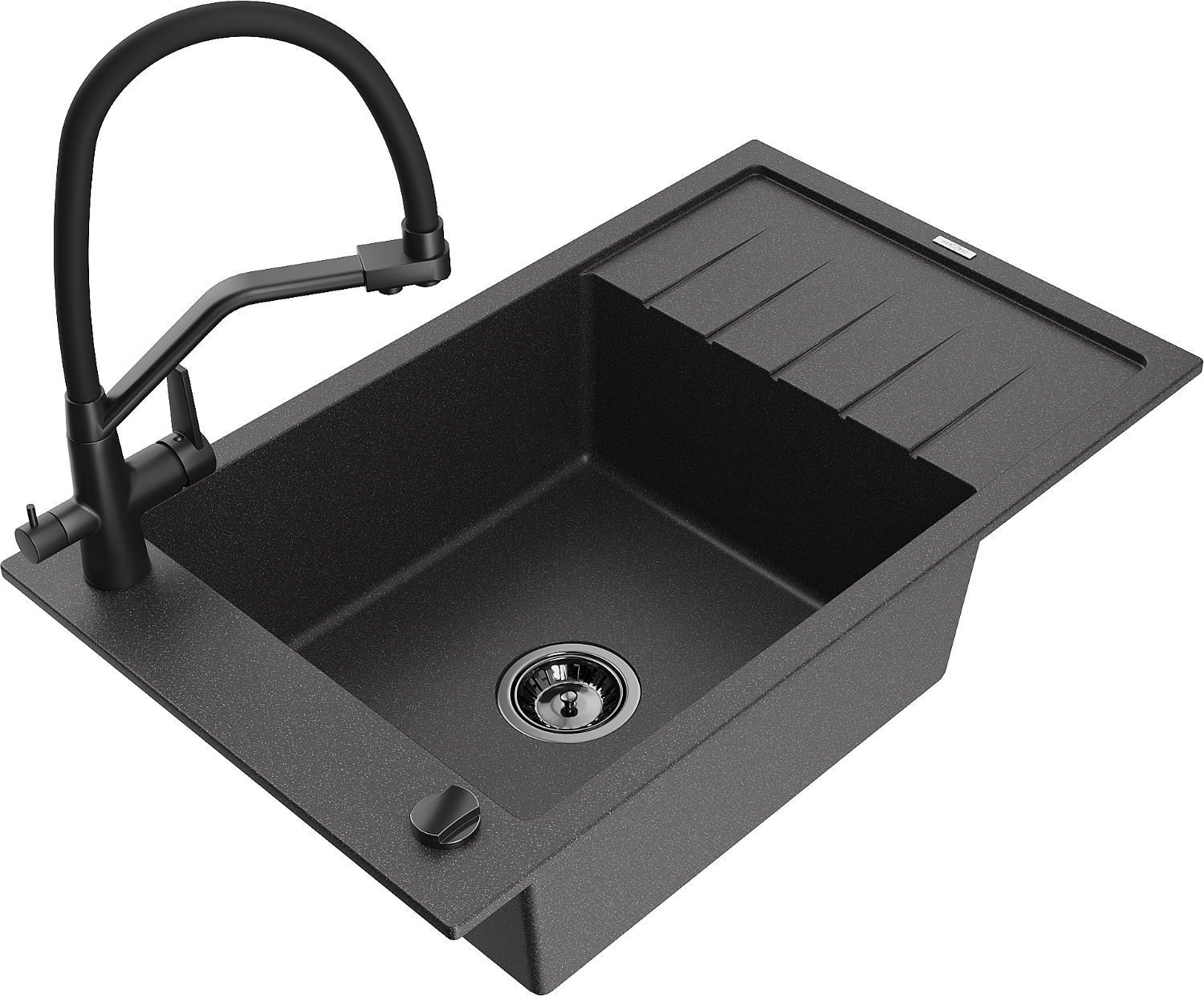 Mexen Elias granitē izlietne ar vienu nodalījumu, ar noteces sistēmu un virtuvei Duo jaucējkrānu, melns plankumots