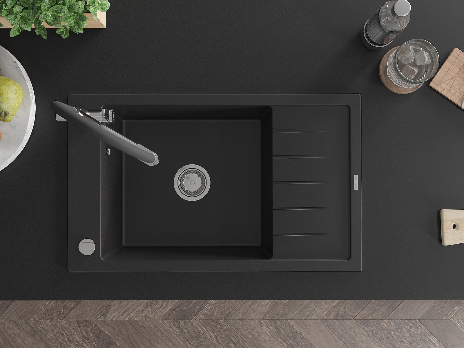 Mexen Elias 1-kameras granīta izlietne ar notecesvietu un virtuves jaucējkrānu Duo, melns - 6511-77-671701-07