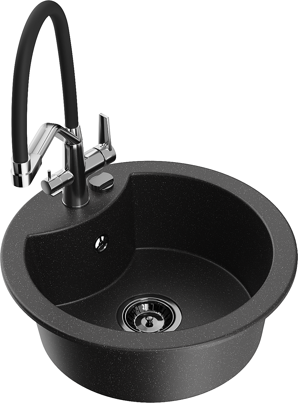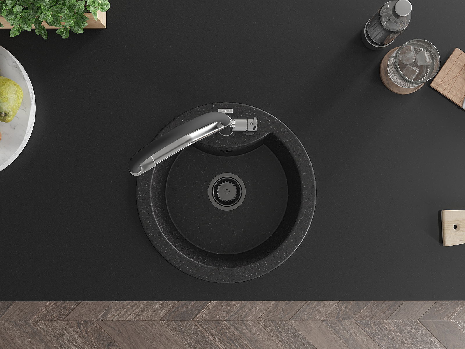Mexen Diego granit izlietne ar vienu nodalījumu ar virtuves jaucējkrānu Duo, melns/sudraba metāliskais - 6512-73-671701-07-B