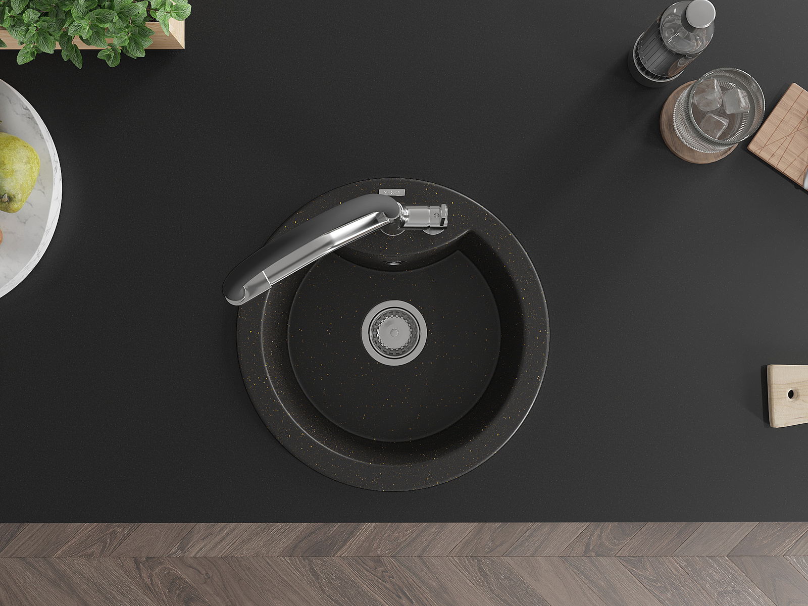 Mexen Diego granīta izlietne ar 1 nodalījumu un virtuves maisītāju Duo, melns/zeltīts metālisks - 6512-75-671701-07