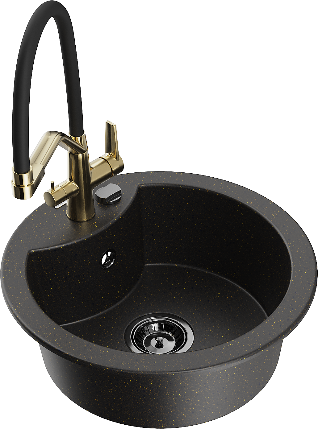 Mexen Diego granitizlietne 1-kameras izlietne ar virtuves krānu Duo, melns/zeltīti metalisks - 6512-75-671701-57-B