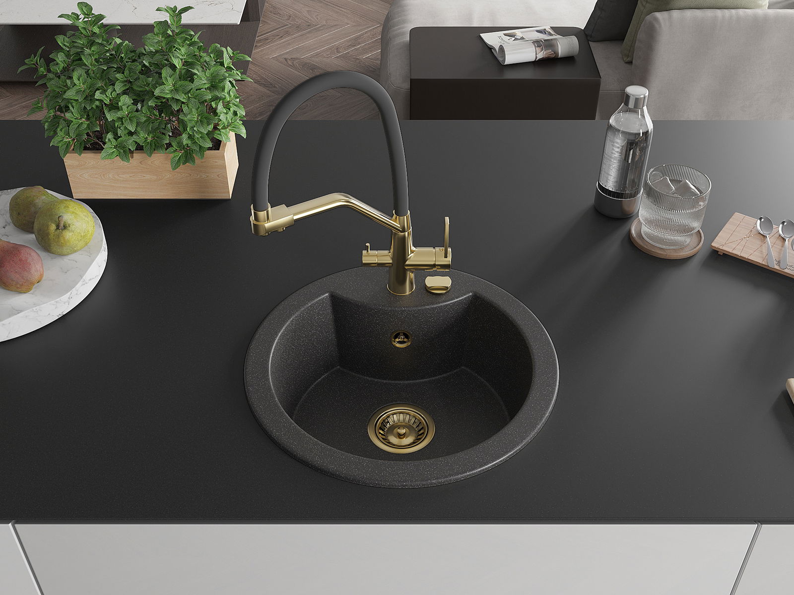Izlietnei ir padziļināts caurums ar diametru 35 mm, kuru varat izsist patstāvīgi. To var izmantot, piemēram, šķidruma dozatora uzstādīšanai, kas novērsīs plastmasas pudeļu klātbūtni virtuvē un piešķirs tai elegantu apdari.
