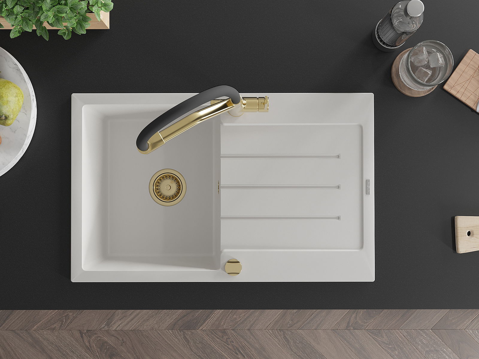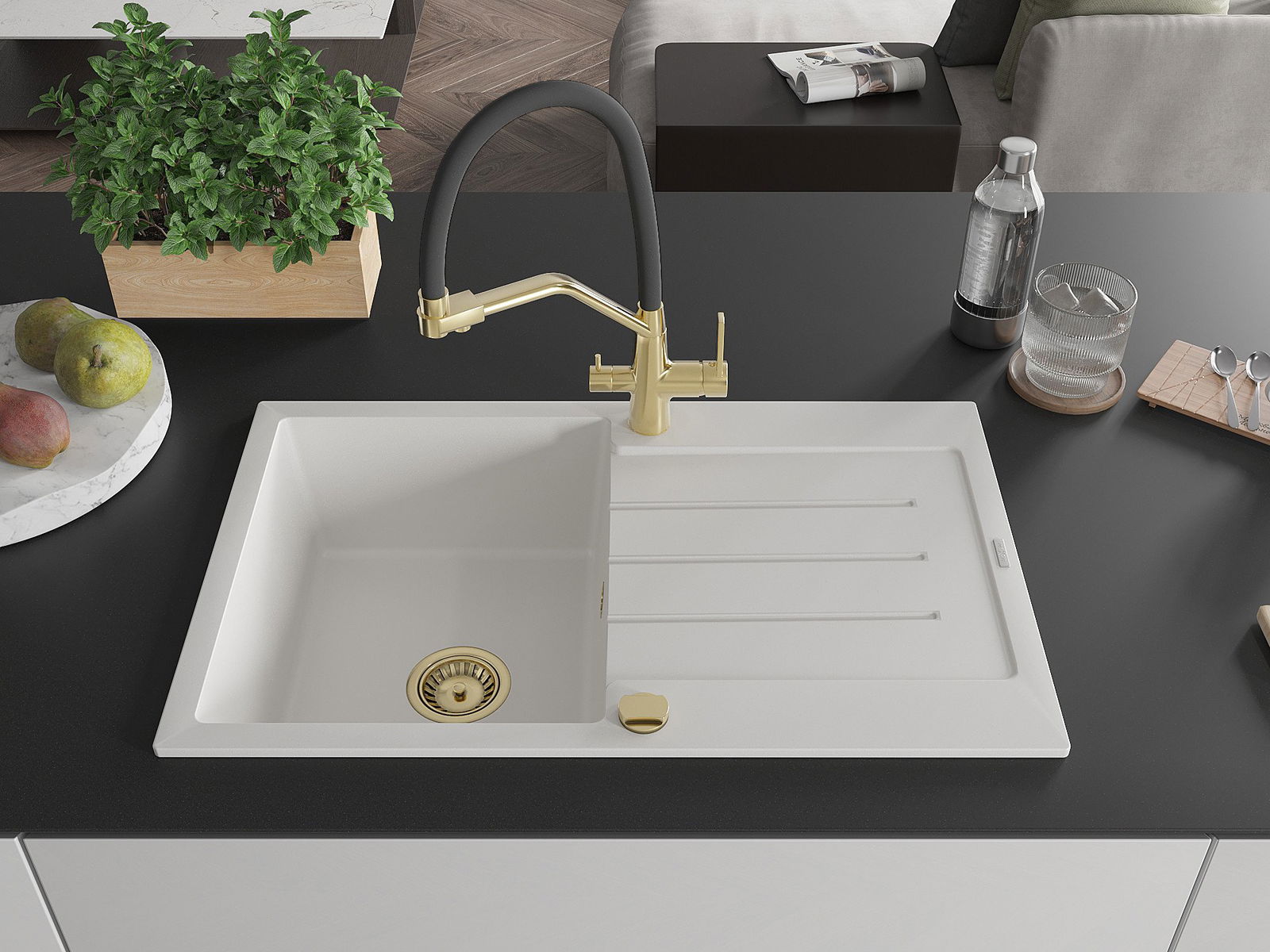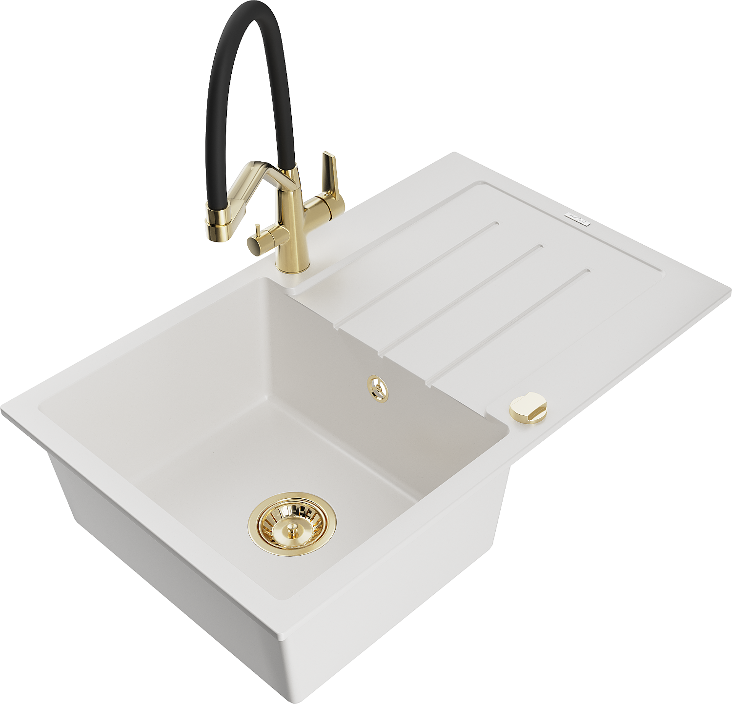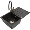 Mexen Bruno granīta izlietne ar 1 nodalījumu, noteces vietu un virtuves jaucējkrānu Duo, balta - 6513-20-671701-57-G