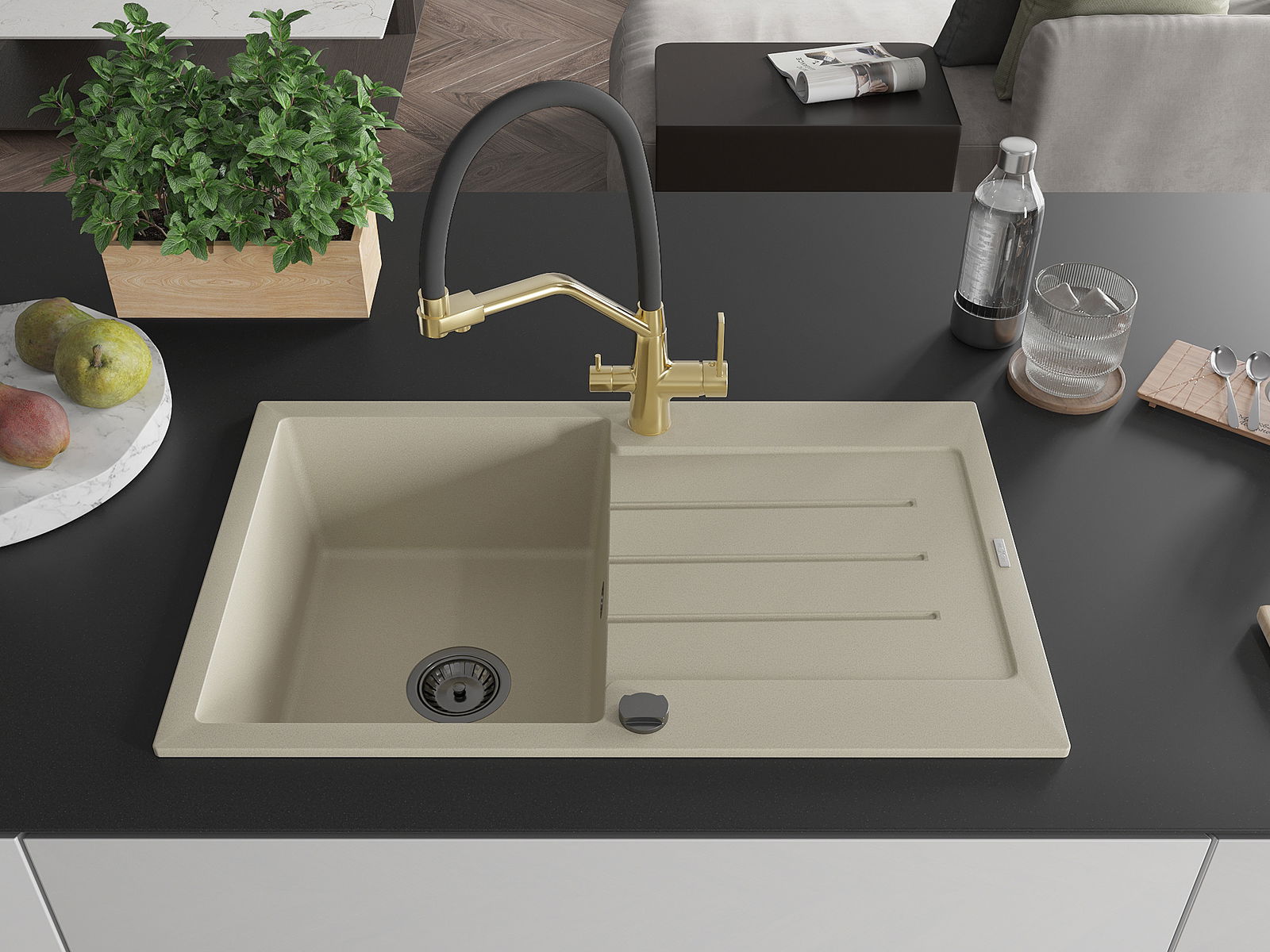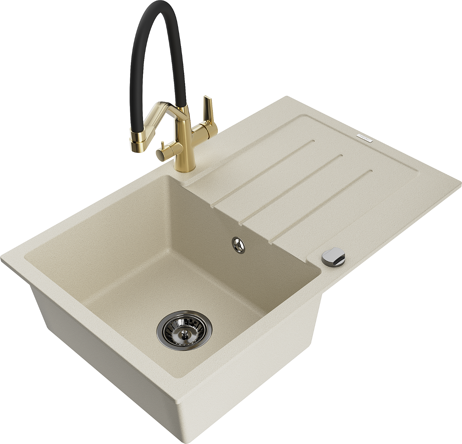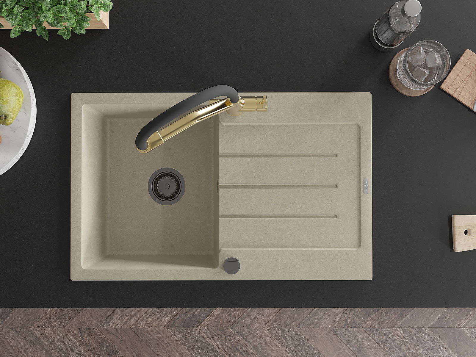 Mexen Bruno granitais izlietne ar vienu nodalījumu un noteces plāksni un virtuves jaucējkrāni Duo, bēšs - 6513-69-671701-57-B