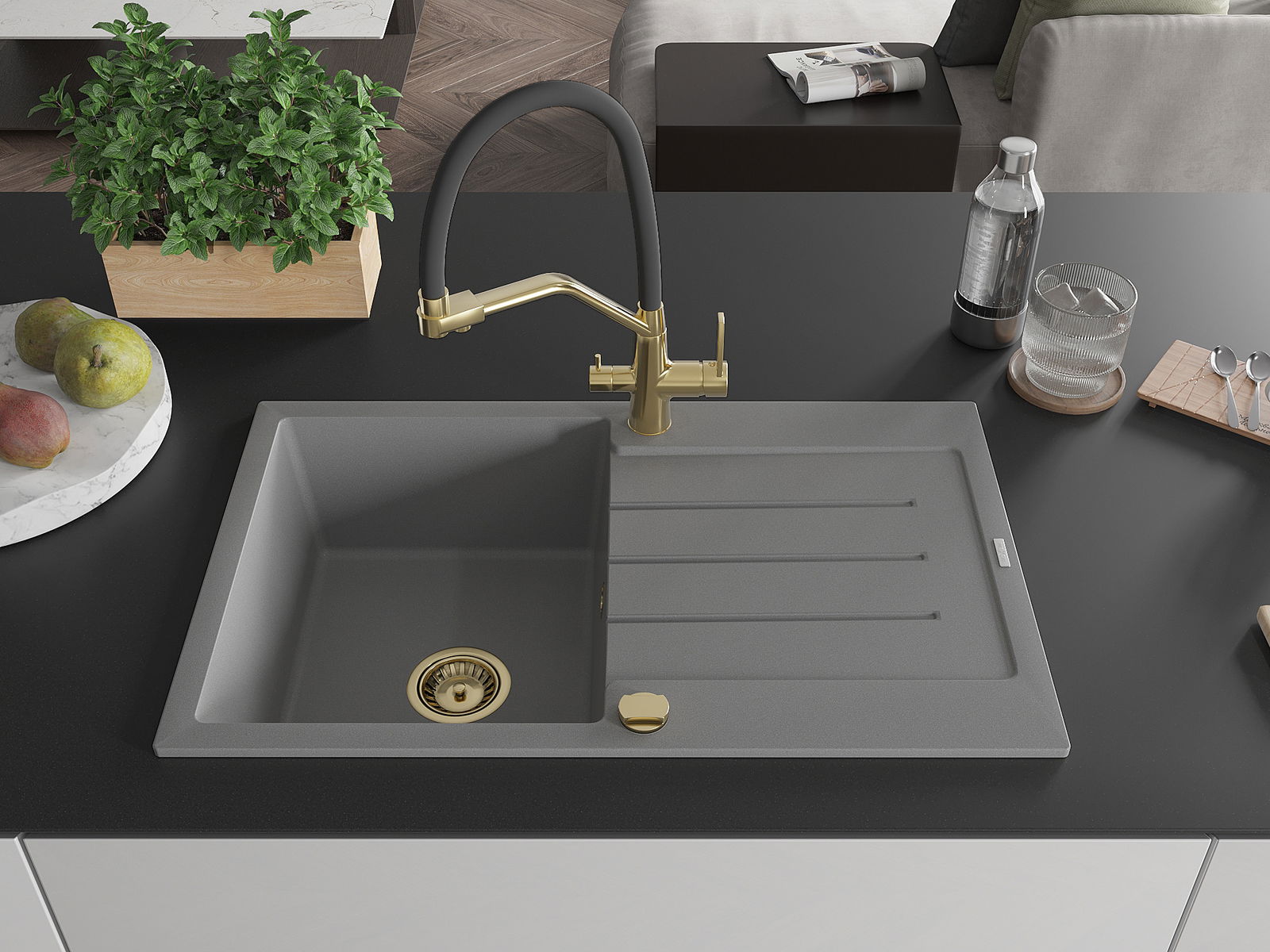 Mexen Bruno 1 nodalījuma granīta izlietne ar noteces vietu un Duo virtuves jaucējkrānu, pelēka - 6513-71-671701-57-G