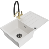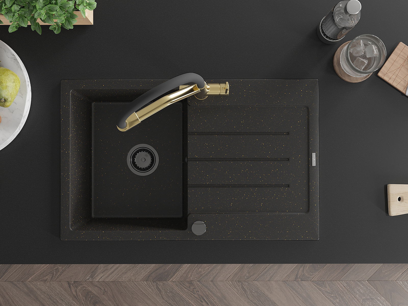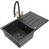 Mexen Bruno granitne viena nodalījuma izlietne ar noteces zonu un virtuves jaucējkrānu Duo, melns/zelta metālisks