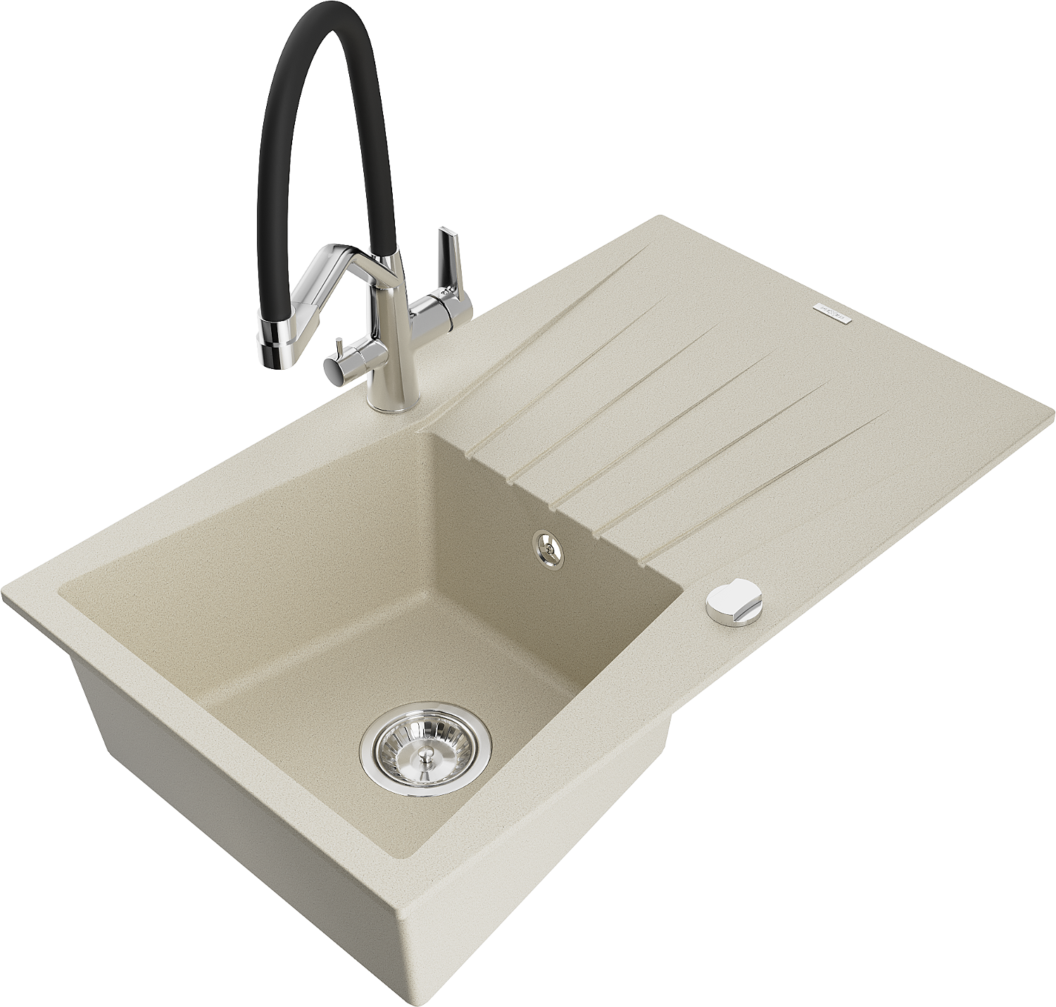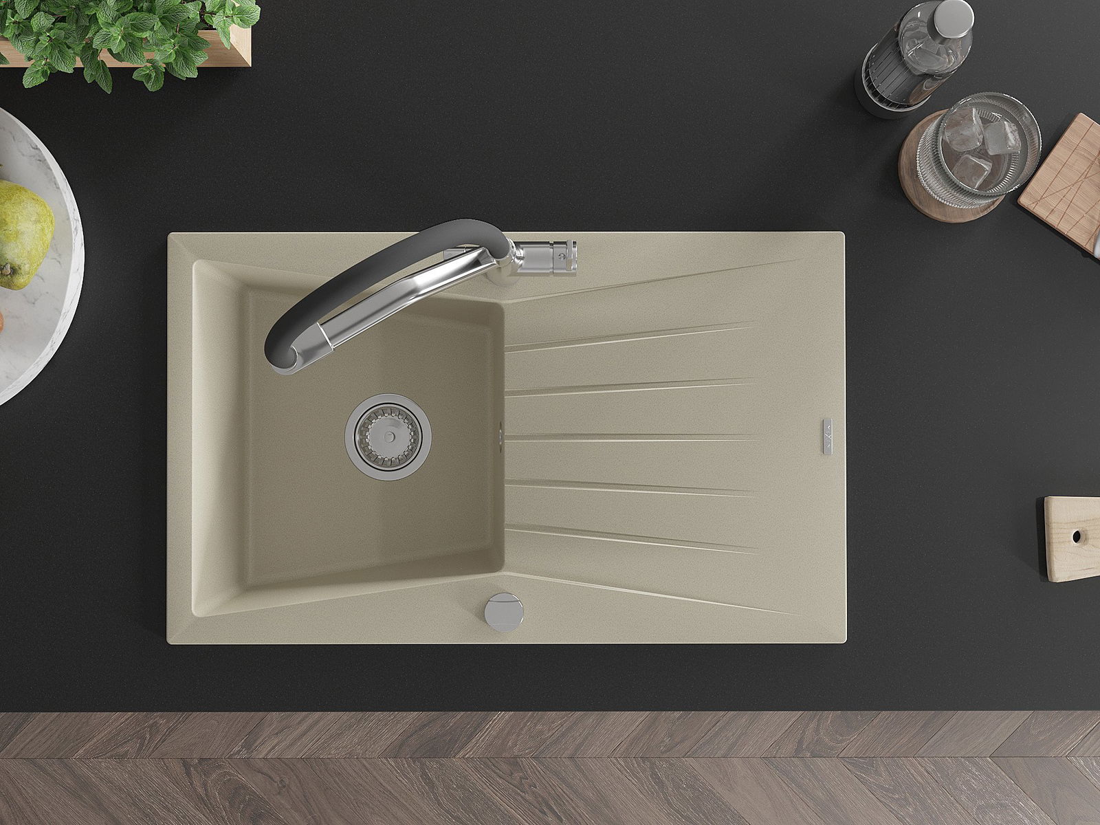 Mexen Cesar granīta izlietne ar vienu nodalījumu ar noteces zonu un virtuves krāna Duo, bēšs - 6514-69-671701-07