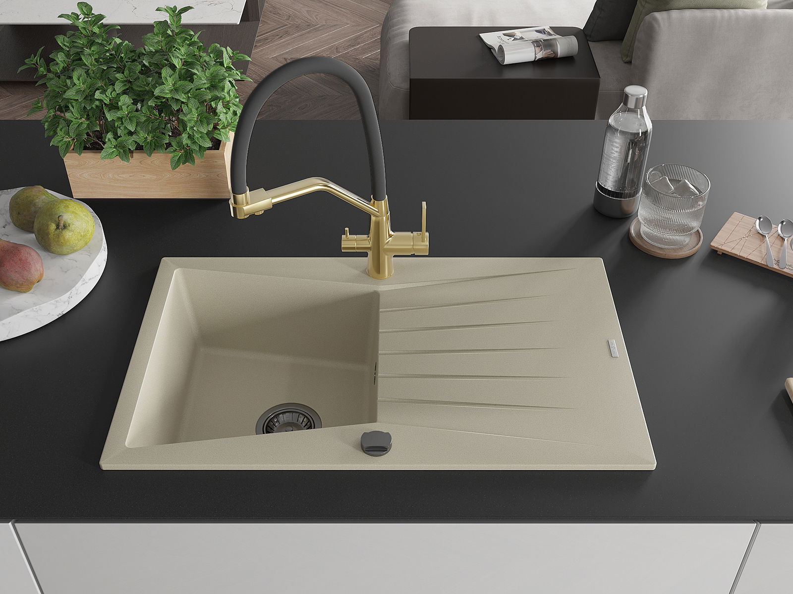 Mexen Cesar vienasistabas granīta izlietne ar noteku un virtuves jaucējkrānu Duo, bēšs - 6514-69-671701-57-B