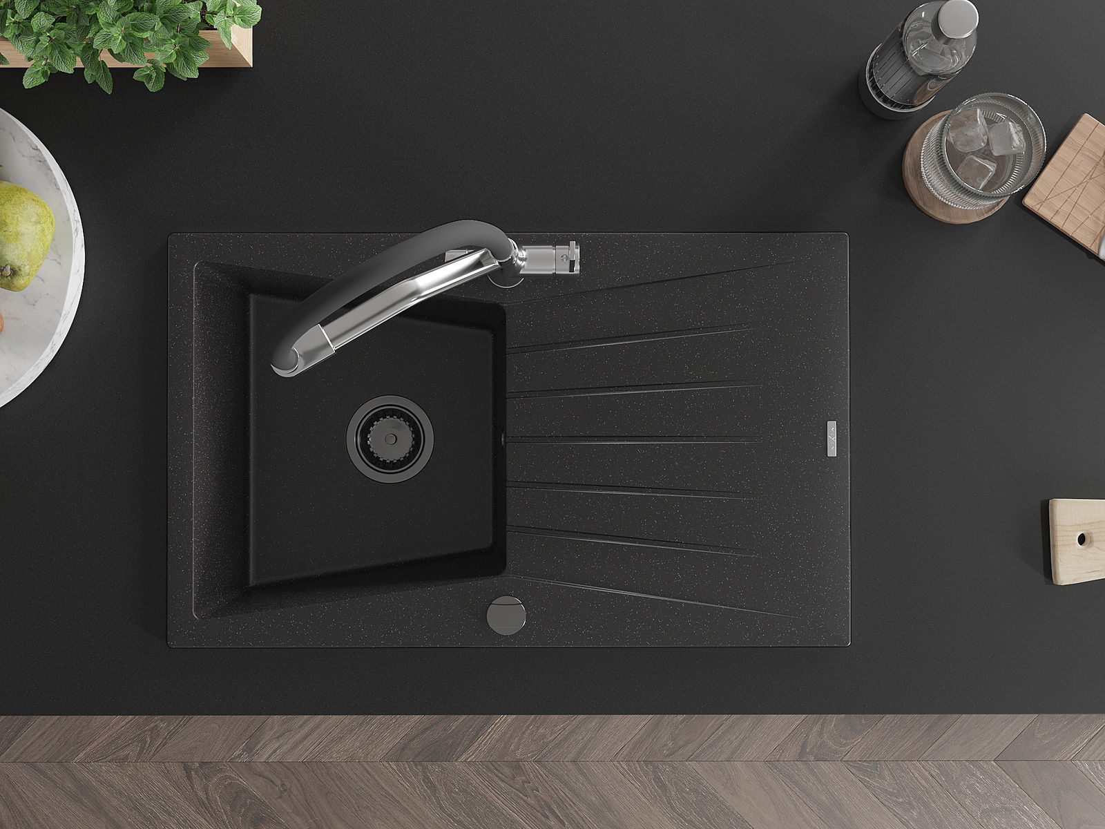 Mexen Cesar granīta izlietne ar vienu nodalījumu, ar noteku un virtuves krānu Duo, melns/sudraba metālika