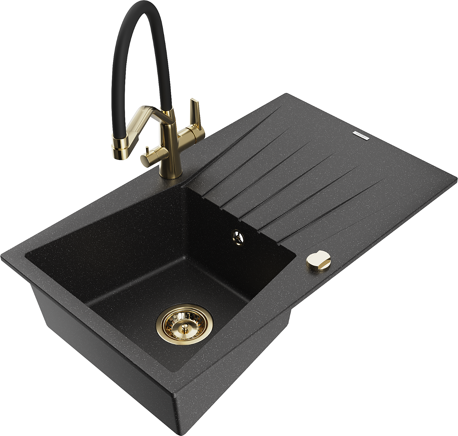 Mexen Cesar granitizlietne ar vienu nodalījumu ar noteces vietu un virtuves jaucējkrānu Duo, melns/sudraba metālika