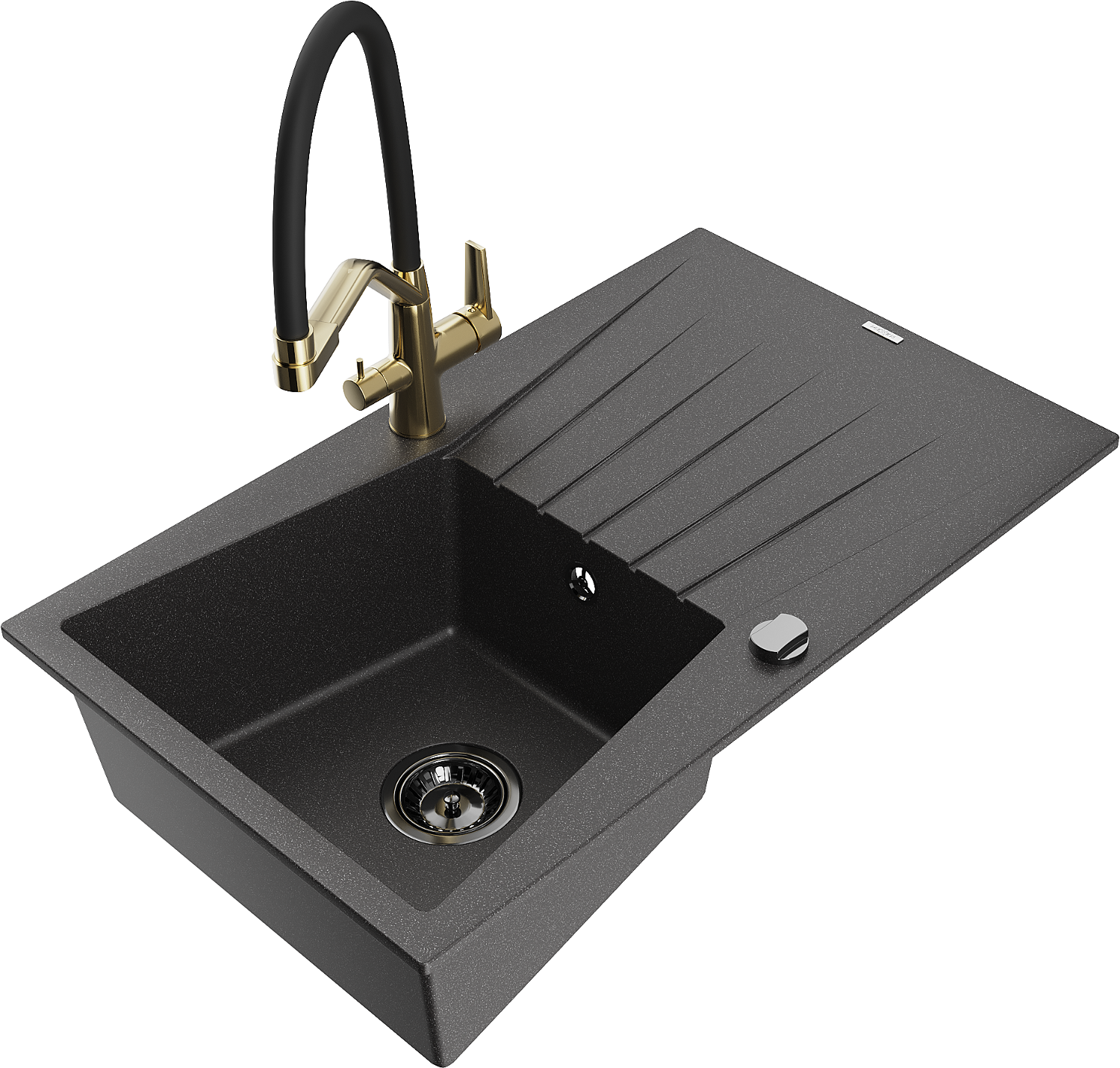 Mexen Cesar granīta izlietne ar vienu nodalījumu un notecinātāju un virtuves jaucējkrānu Duo, melns raibs - 6514-76-671701-57-B