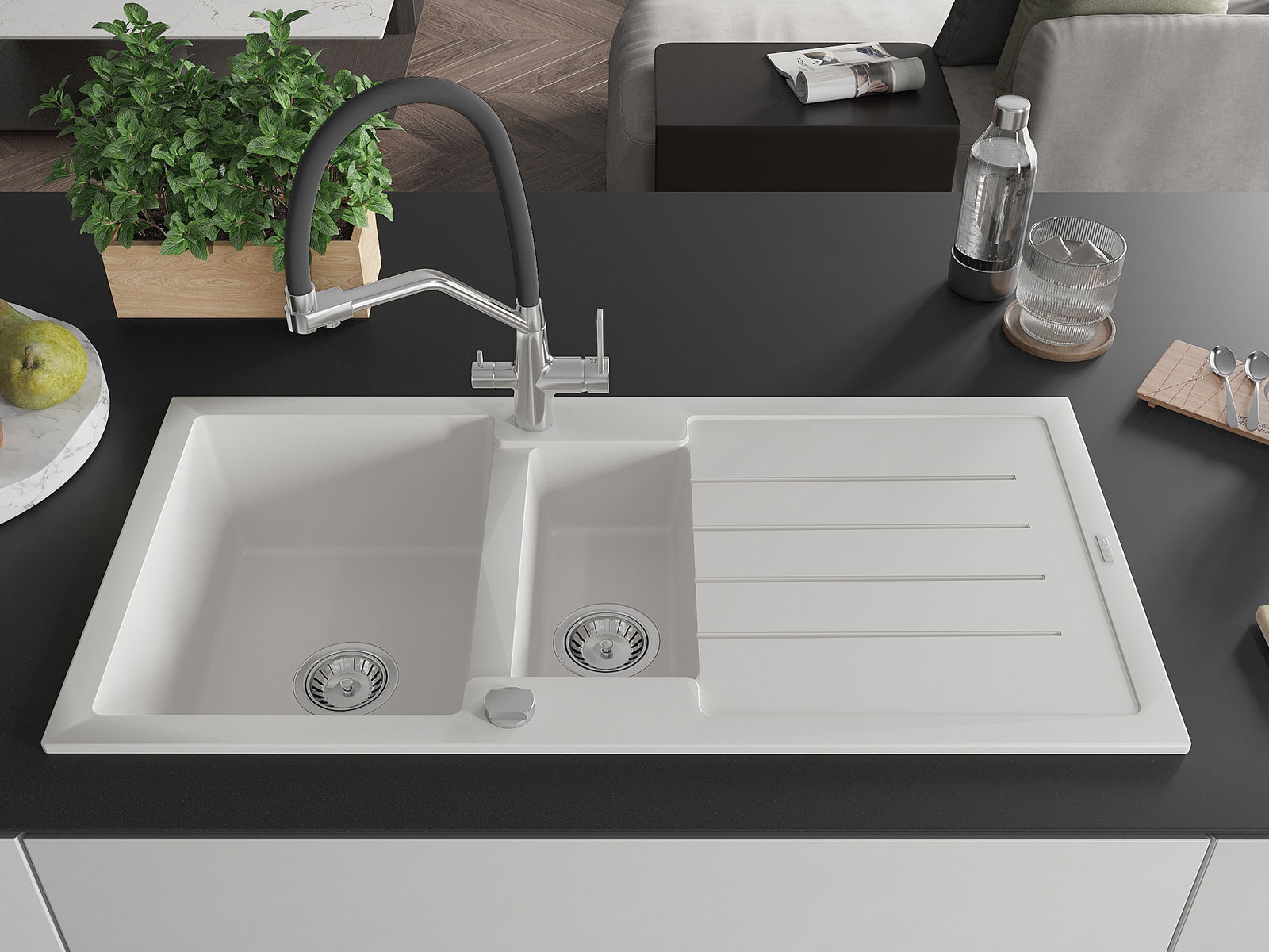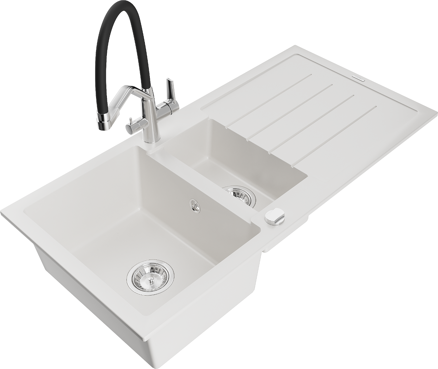 Mexen Andres granit izlietne 1,5 nodalījuma ar notecētāju un Duo virtuves jaucējkrānu, balta - 6515-20-671701-07