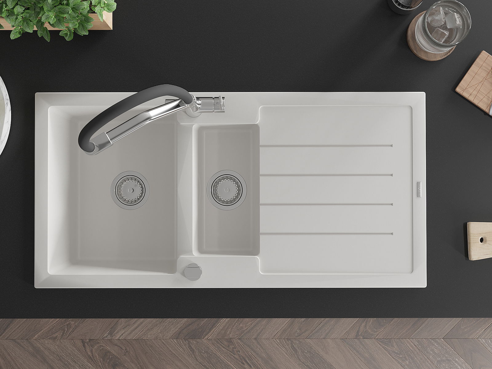 Izlietnei ir 2 daļēji izurbtas atveres ar diametru 35 mm, kuras var pašrocīgi izsist. Tās var izmantot, piemēram, šķidruma dozatora uzstādīšanai, kas novērsīs plastmasas pudeļu klātbūtni virtuvē un piešķirs tai elegantu apdari.