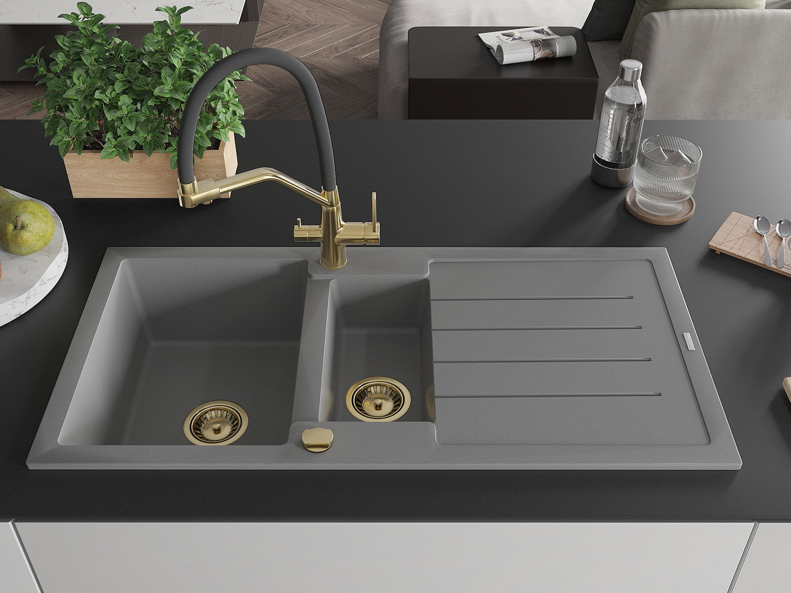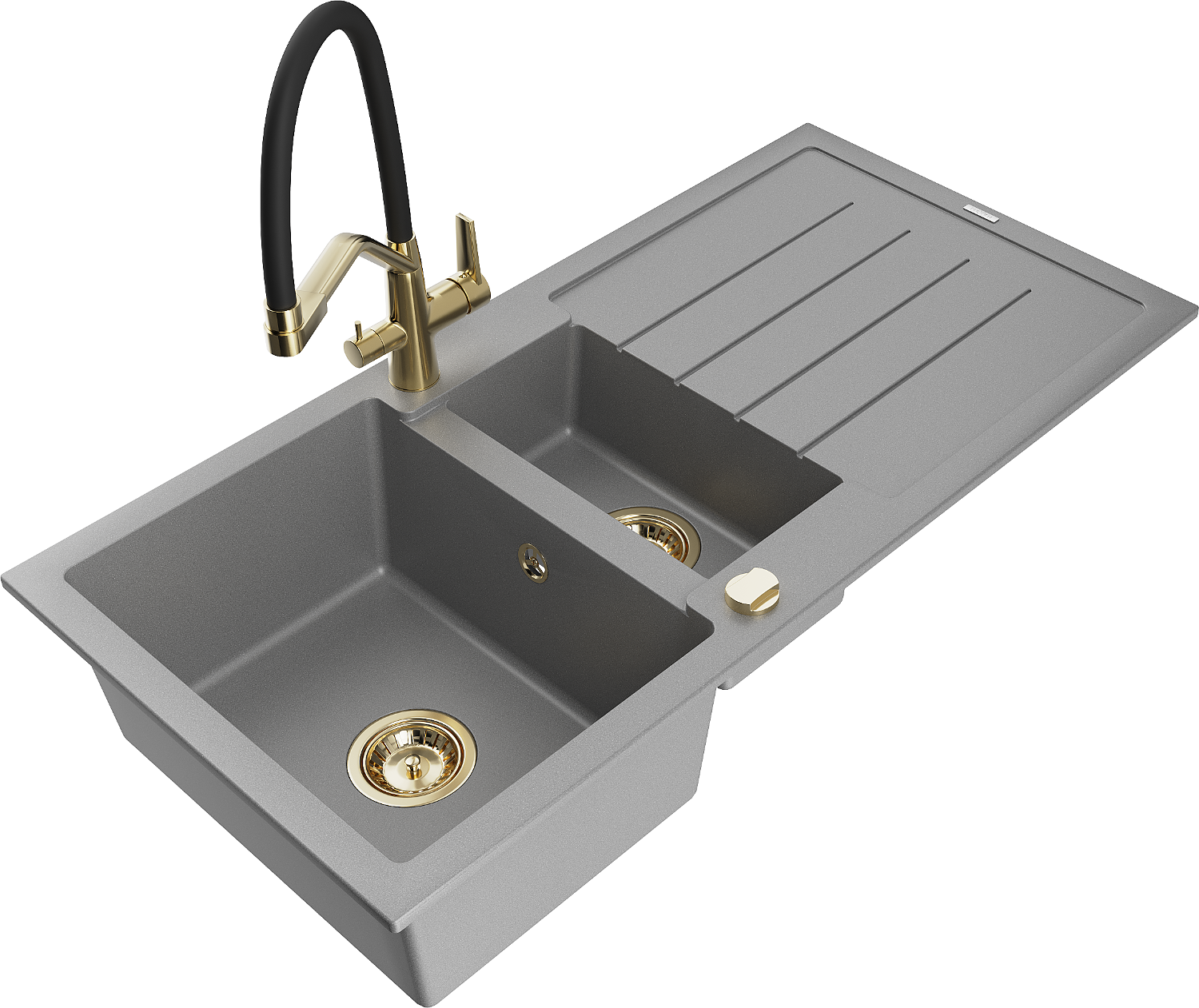 Mexen Andres granitizlietne izlietne ar 1,5 nodalījumiem, notecinātāju un virtuves jaucējkrānu Duo, pelēks - 6515-71-671701-57-G