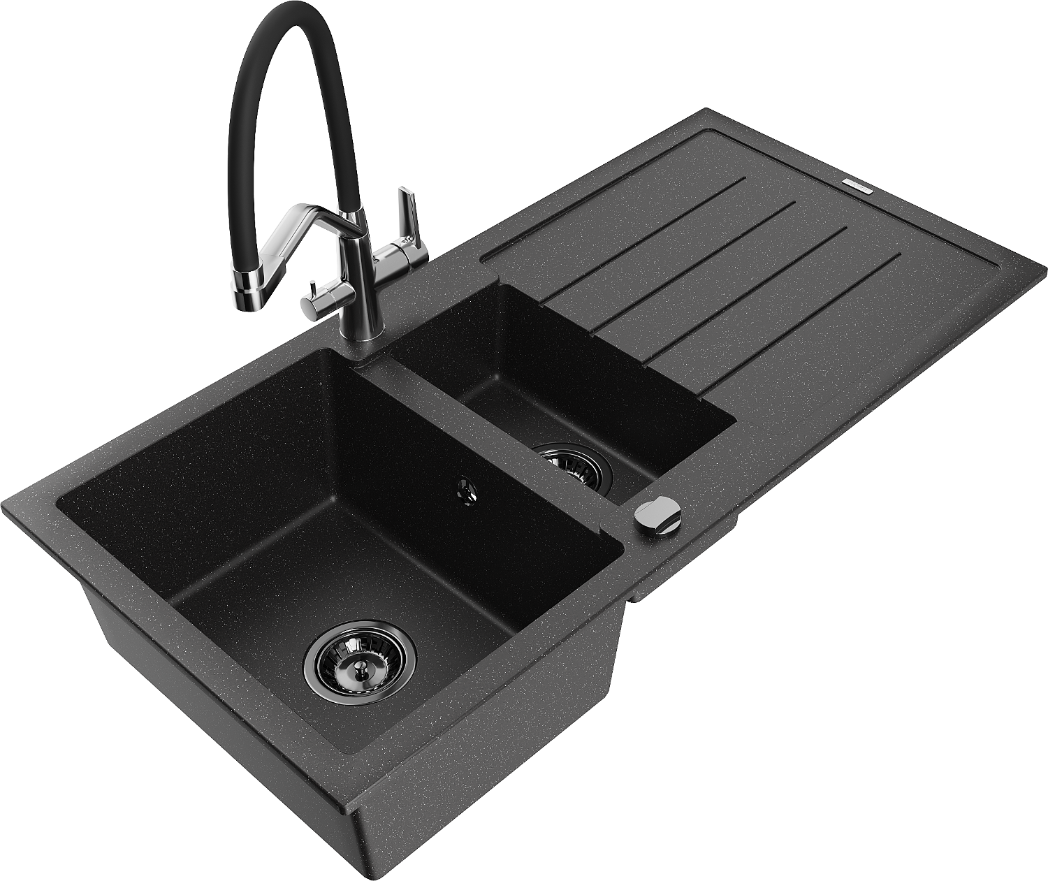 Mexen Andres granitā izlietne ar 1,5 nodalījumiem un drenāžu un virtuves jaucējkrānu Duo, melna/sudraba - 6515-73-671701-07-B