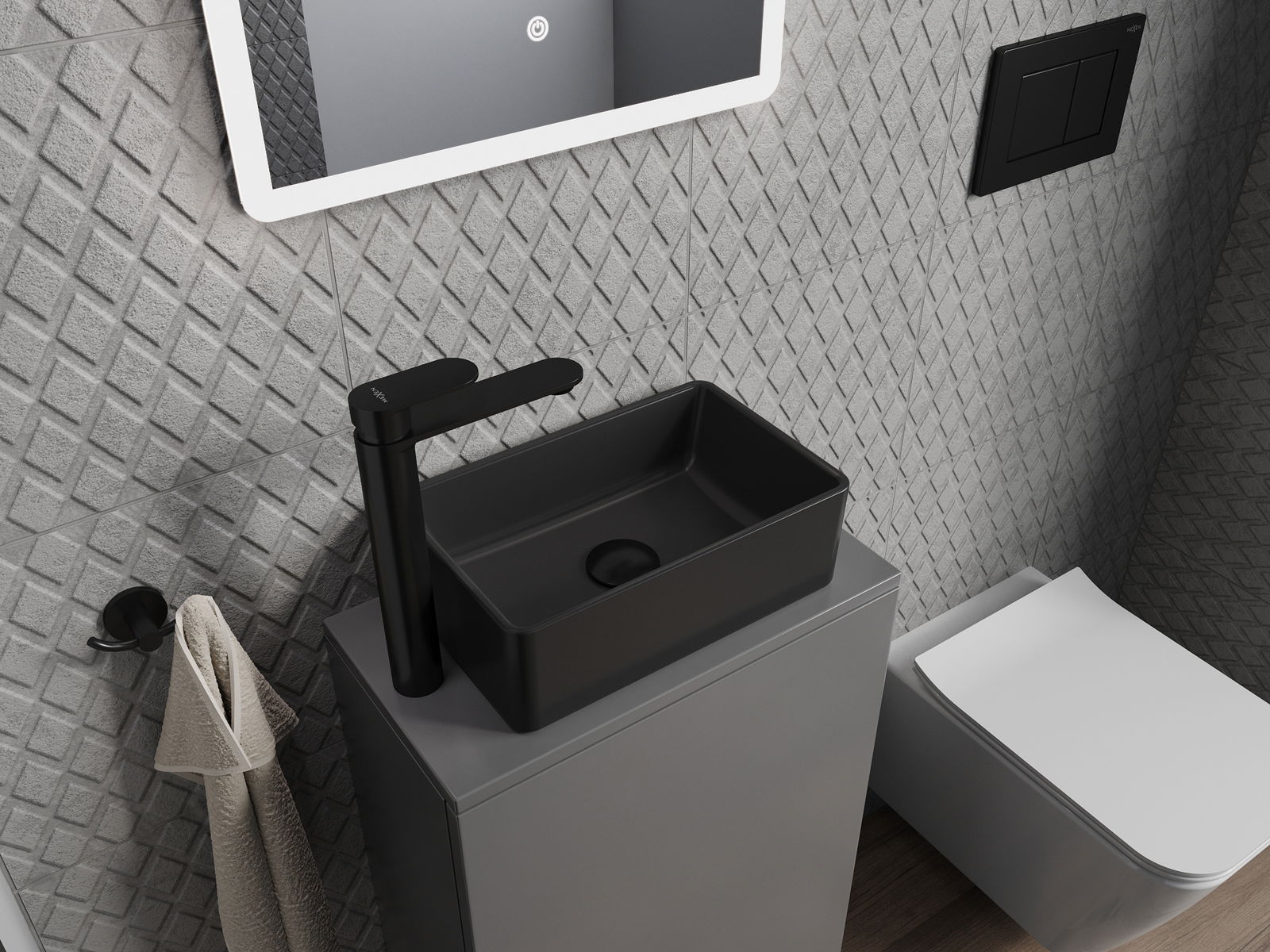 Matētā keramikas virsma lieliski uzsver izstrādājuma krāsas raksturu, piešķirot tam unikālu un izteiksmīgu apdari. Smalkā matētās keramikas struktūra vannas istabā ienes eleganci, radot estētisku telpu.