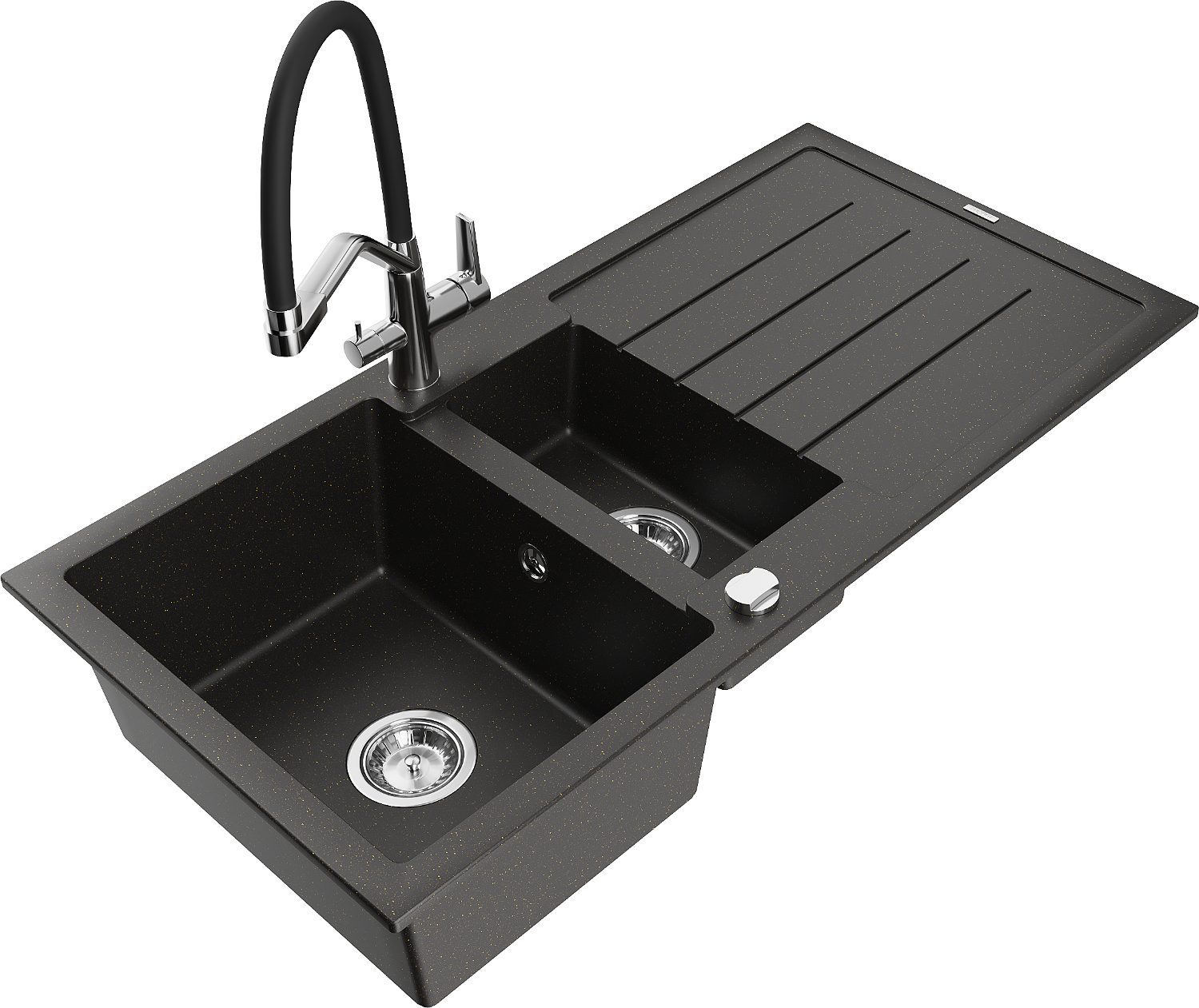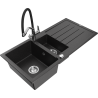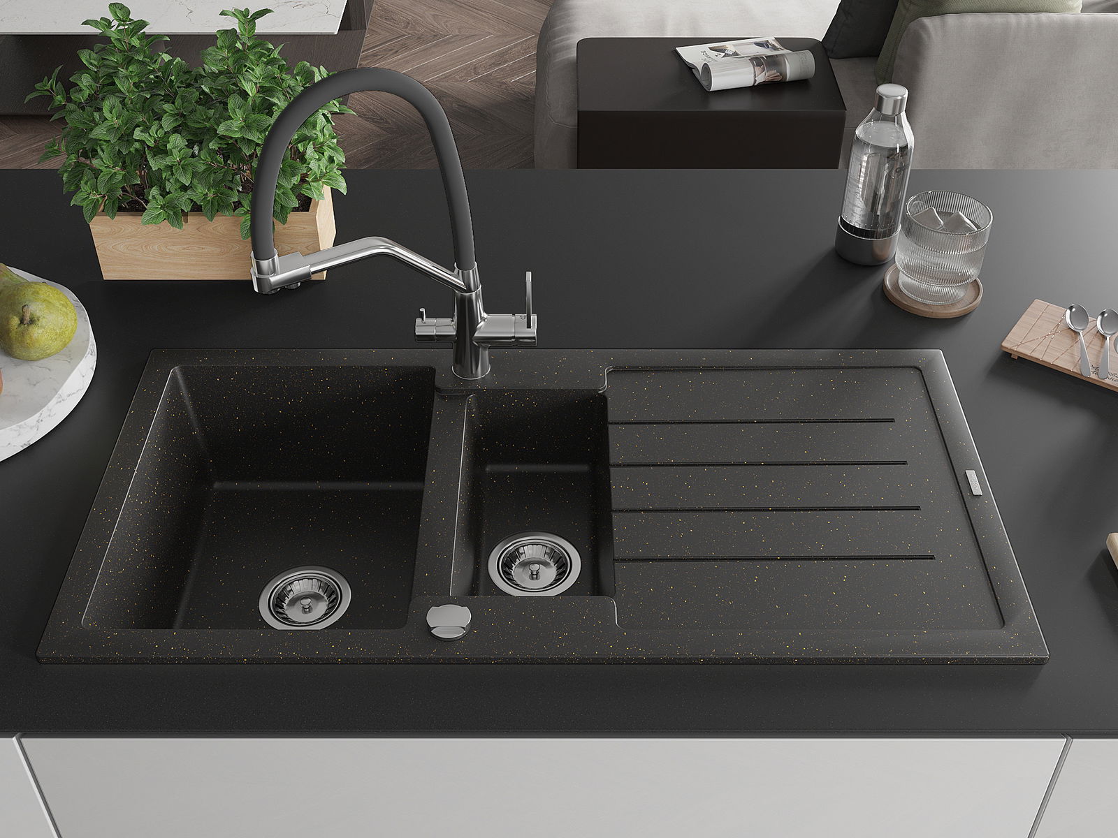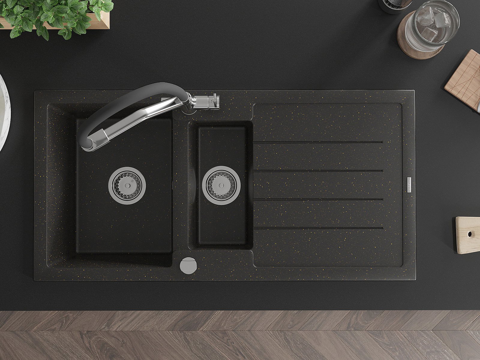 Mexen Andres granīta izlietne ar 1,5 nodalījumiem un noteku, ar virtuves krānu Duo, melna/zeltaina metālika - 6515-75-671701-07