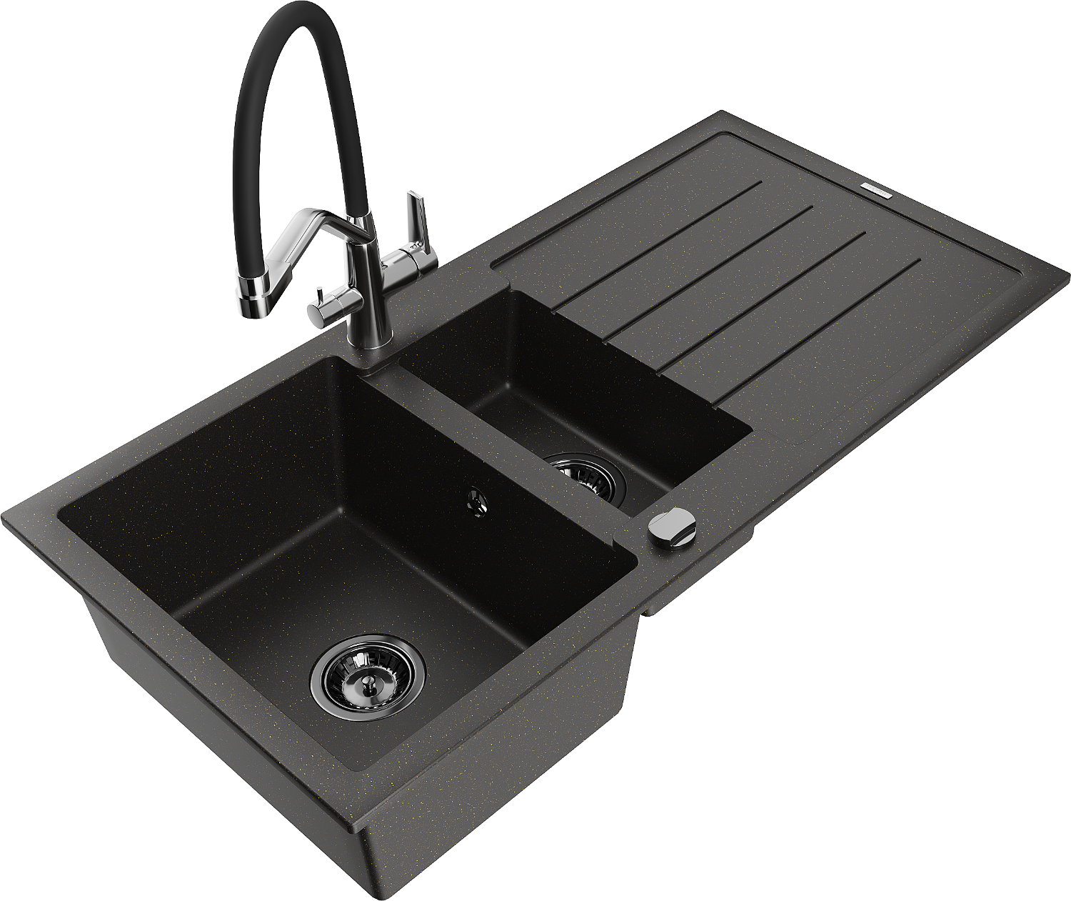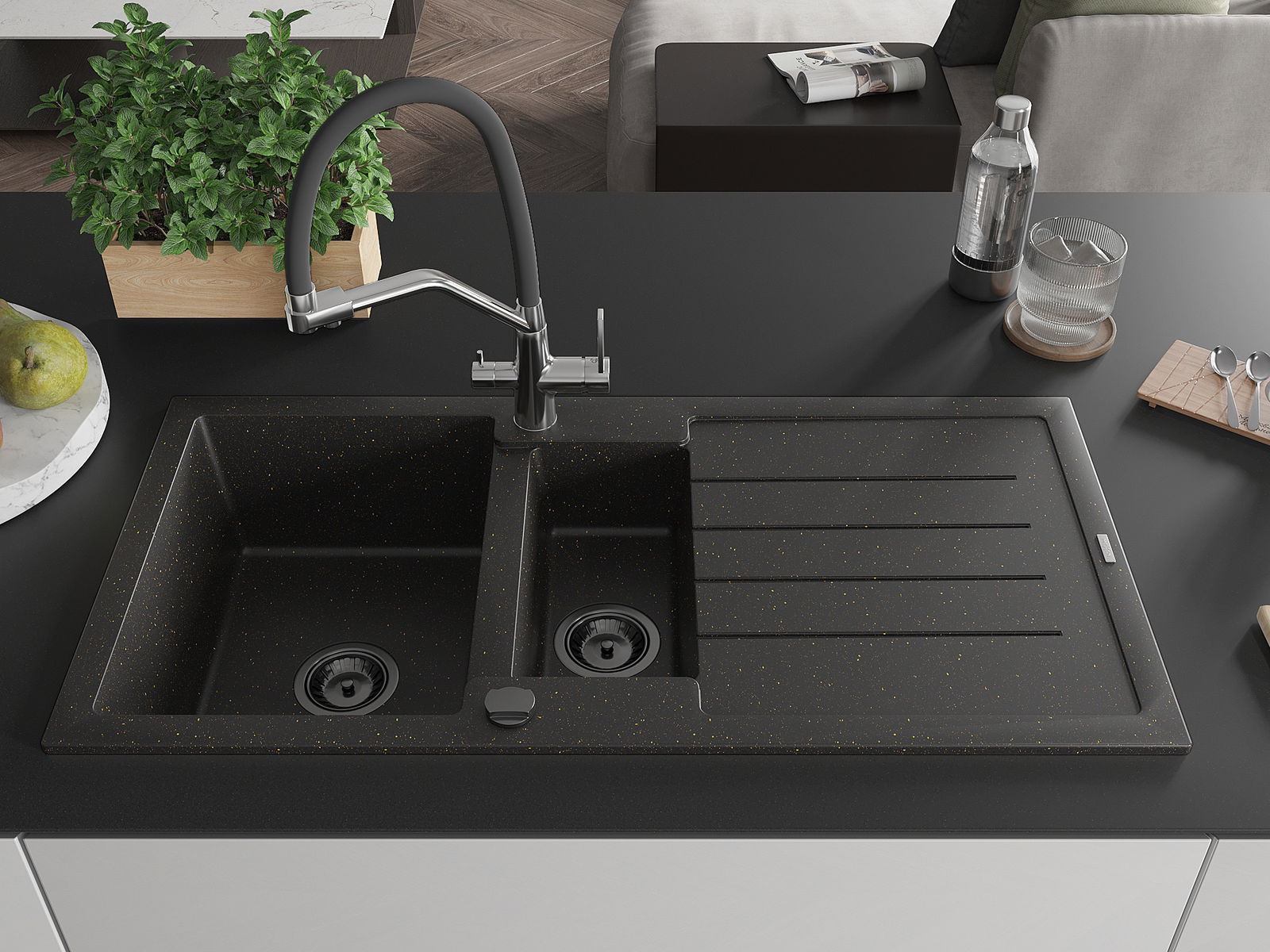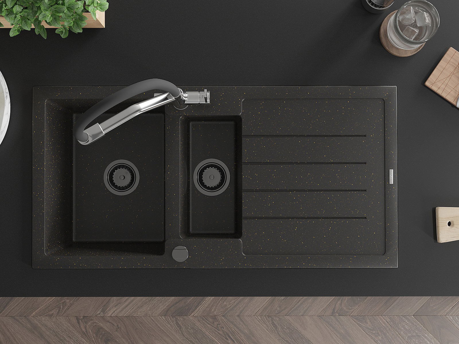 Mexen Andres granīta izlietne 1,5 nodalījumiem ar noteku un virtuves jaucējkrānu Duo, melna/zeltaina metāliskā