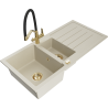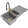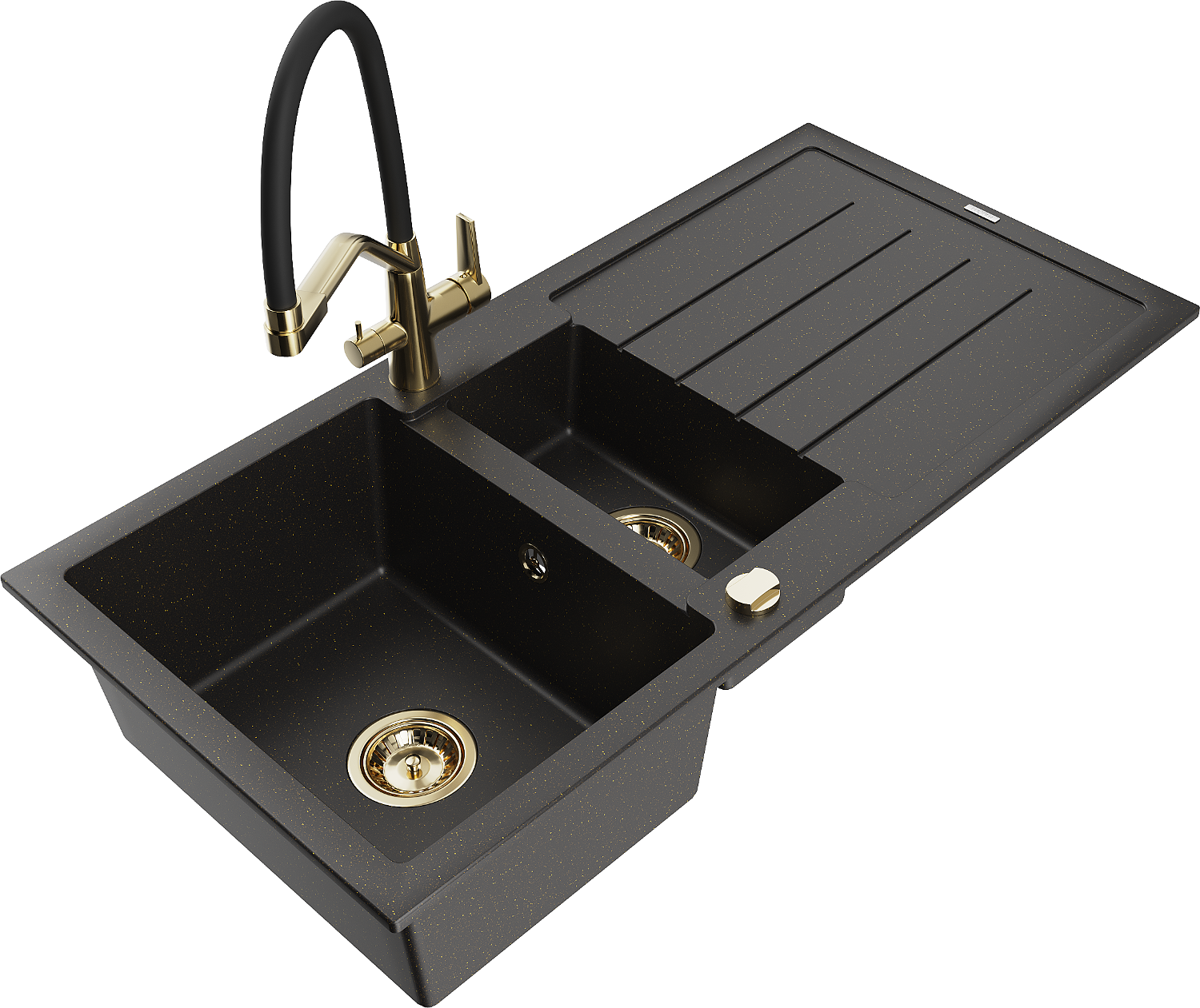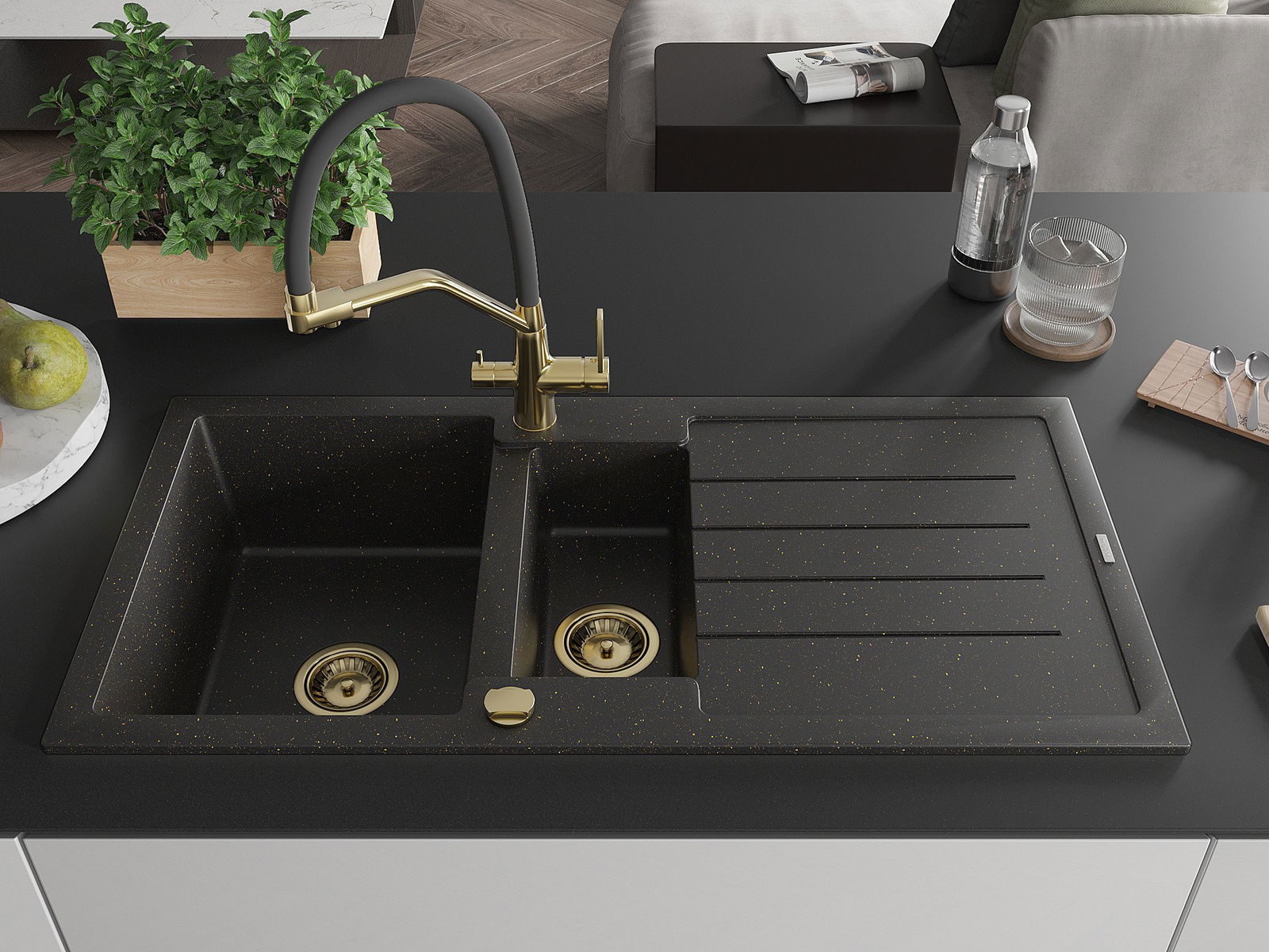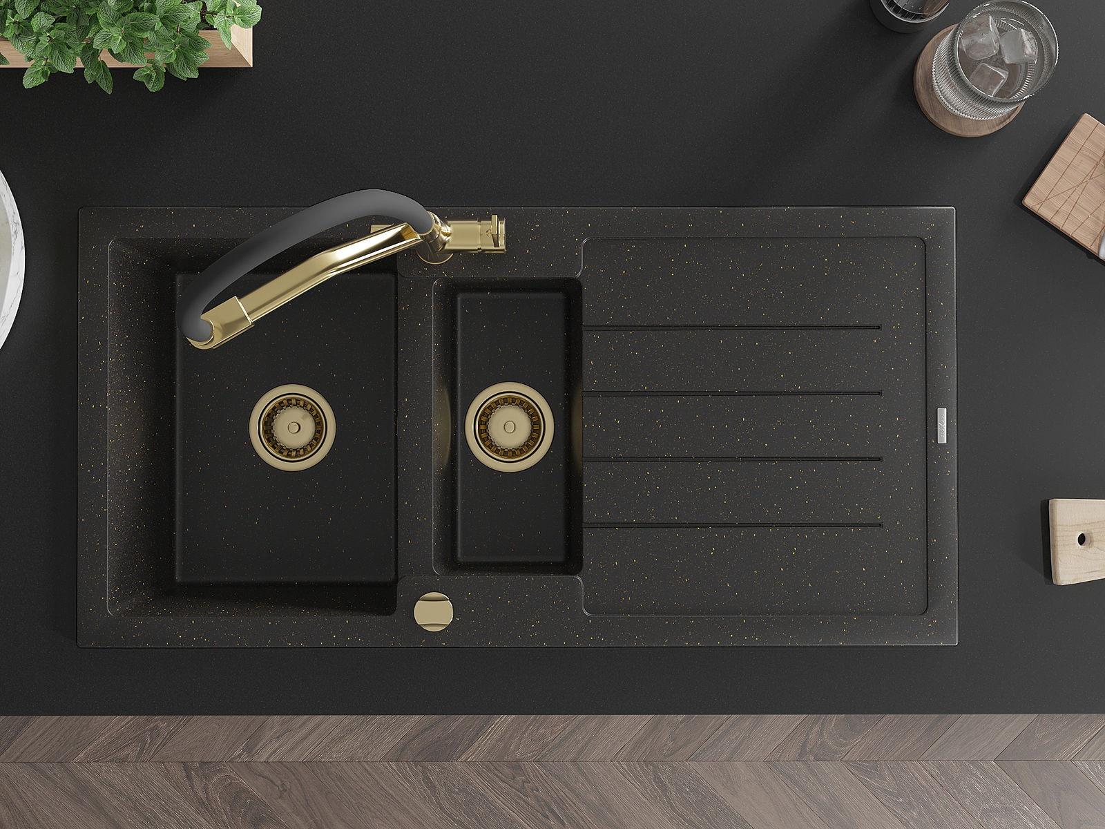 Mexen Andres granit izlietne ar 1,5 nodalījumiem, ar noteci un virtuves jaucējkrānu Duo, melns/zelta metāliks