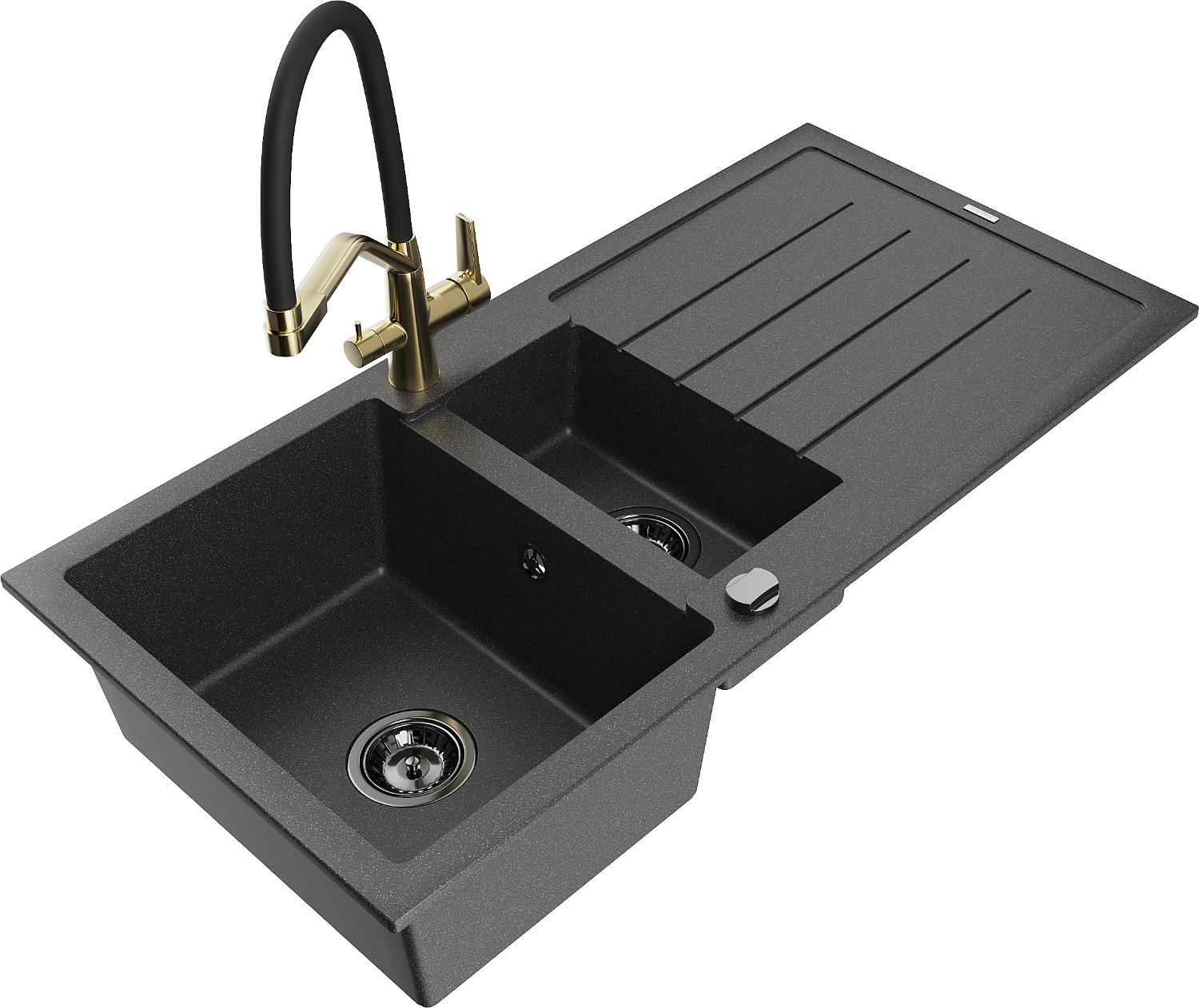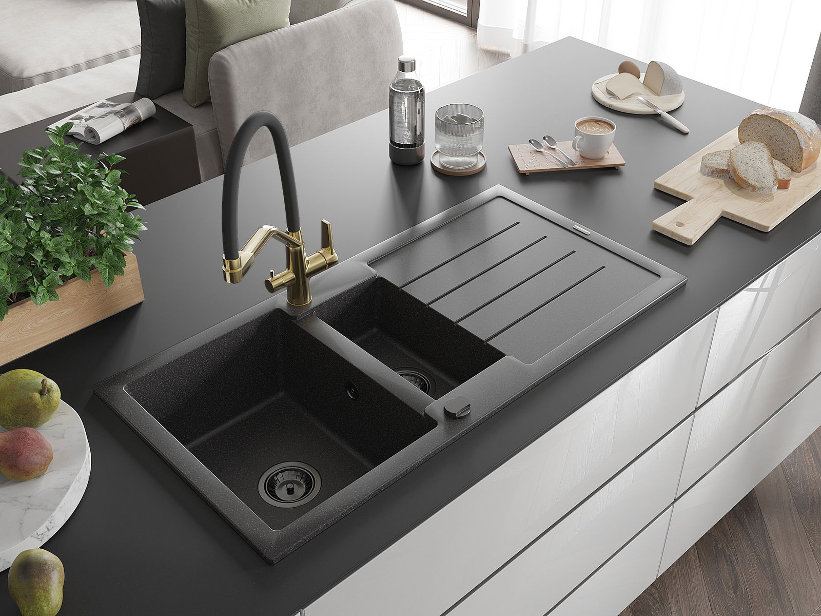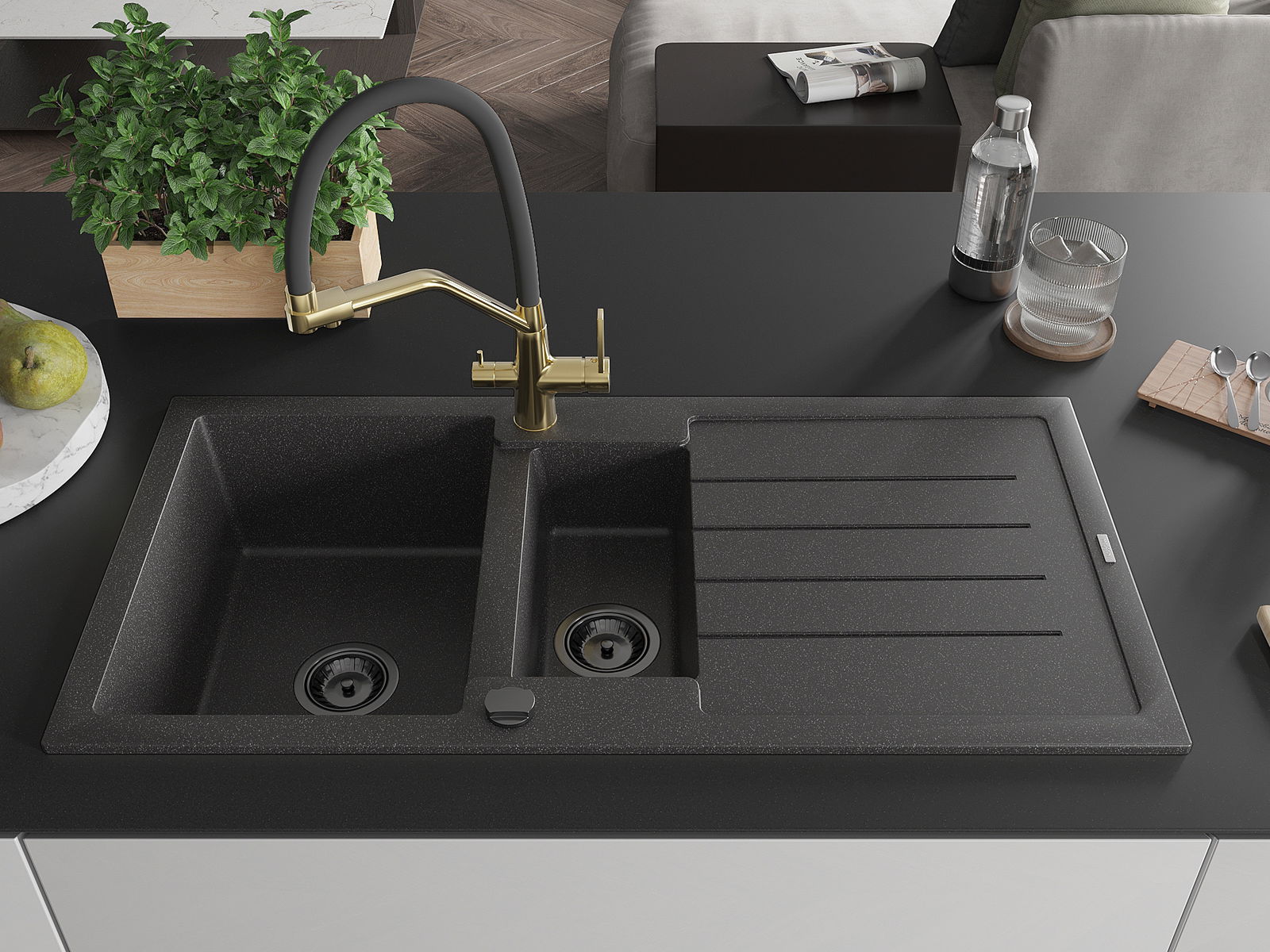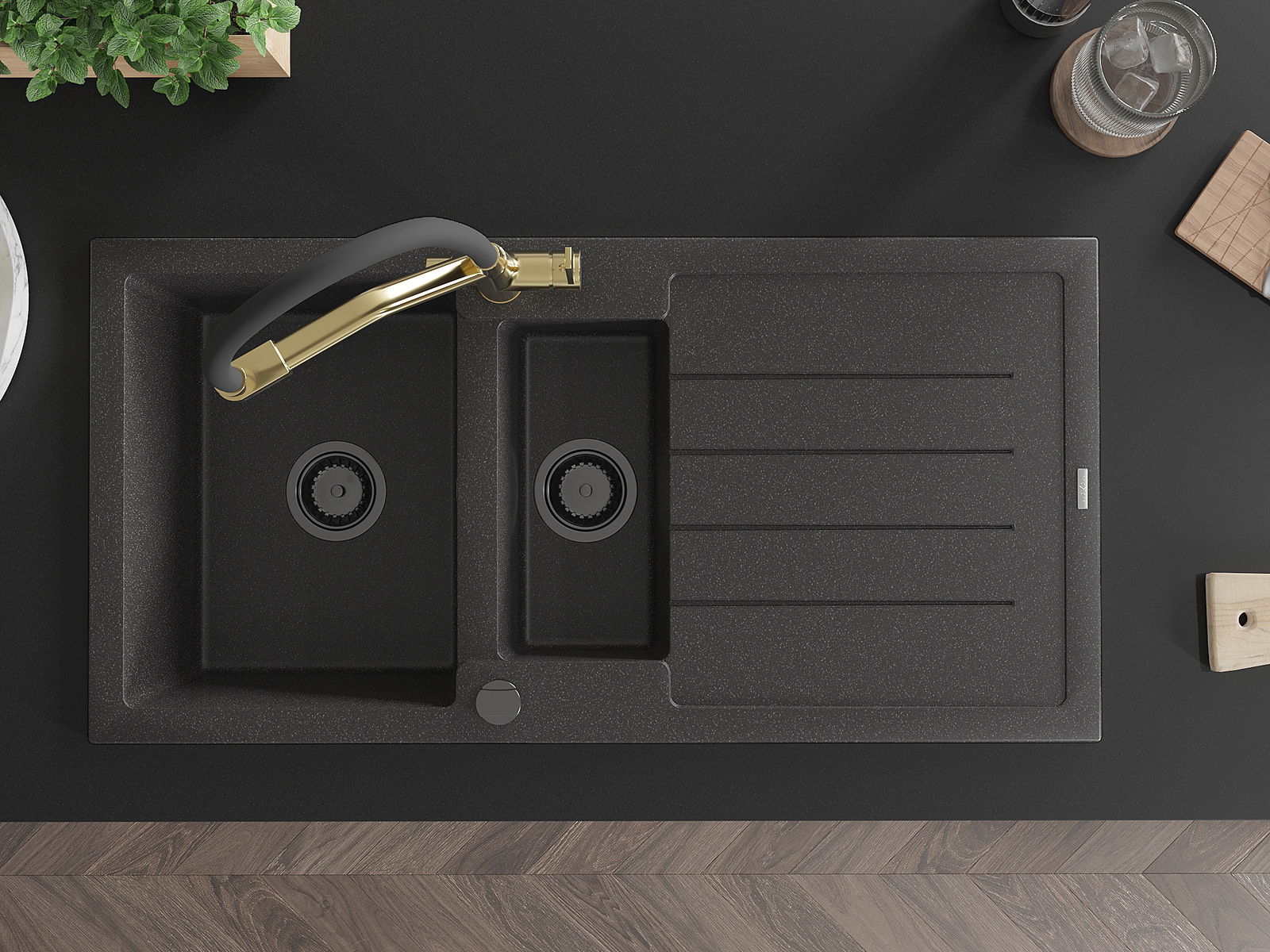 Izlietnei ir 2 daļēji izurbtas atveres ar diametru 35 mm, kuras var pašrocīgi izsist. Tās var izmantot, piemēram, šķidruma dozatora uzstādīšanai, kas novērsīs plastmasas pudeļu klātbūtni virtuvē un piešķirs tai elegantu apdari.