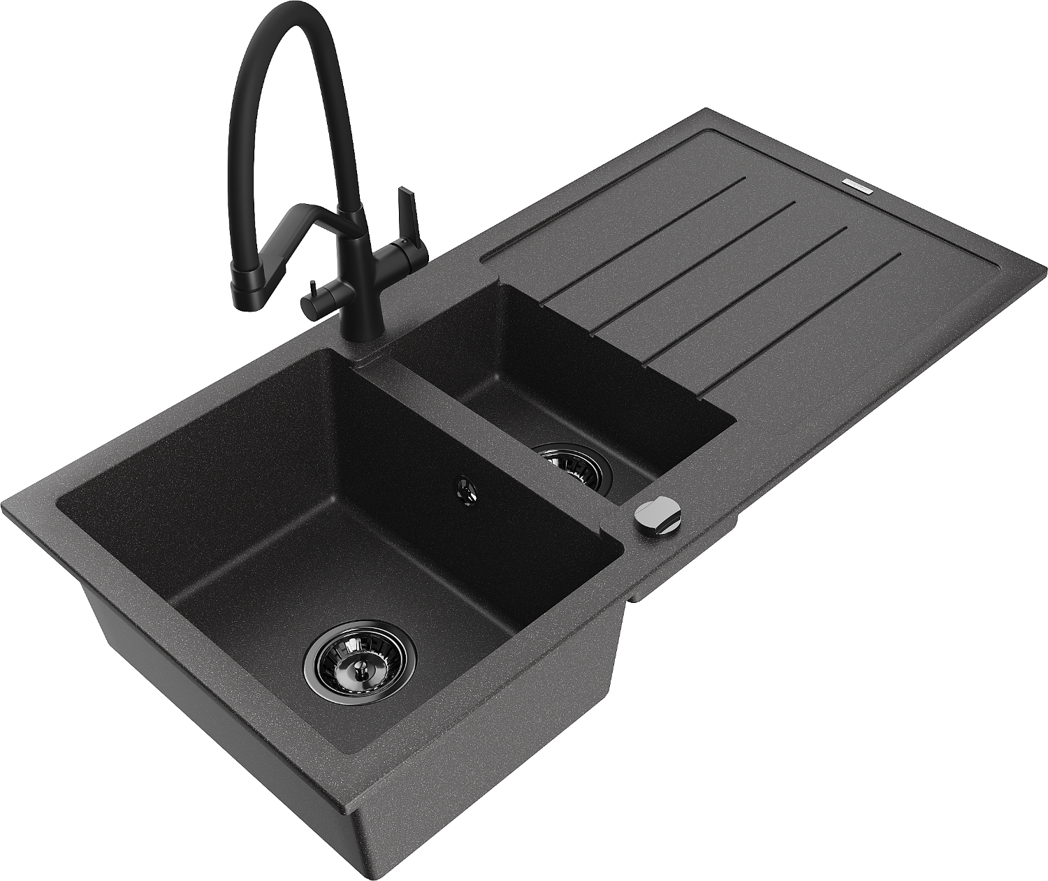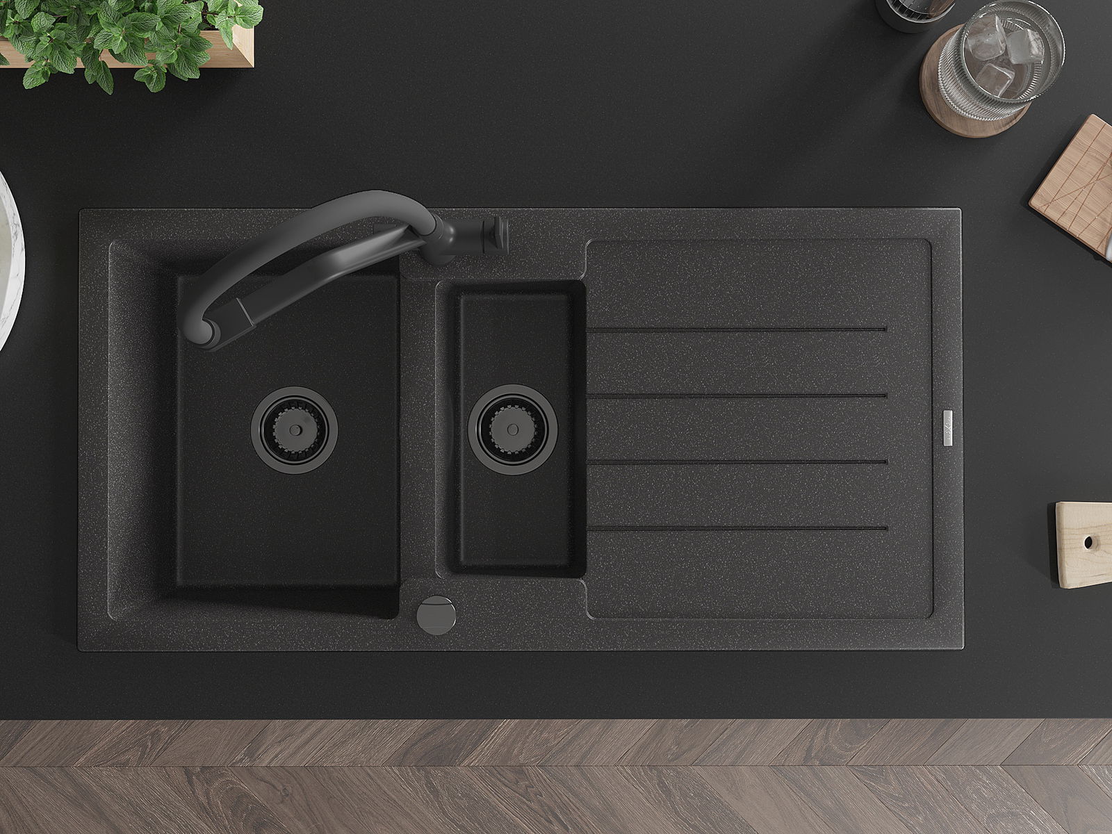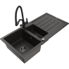 Mexen Andres granit izlietne ar 1,5 kameru, notecinātāju un jaucējkrānu Duo, melna ar plankumiem - 6515-76-671701-70-B