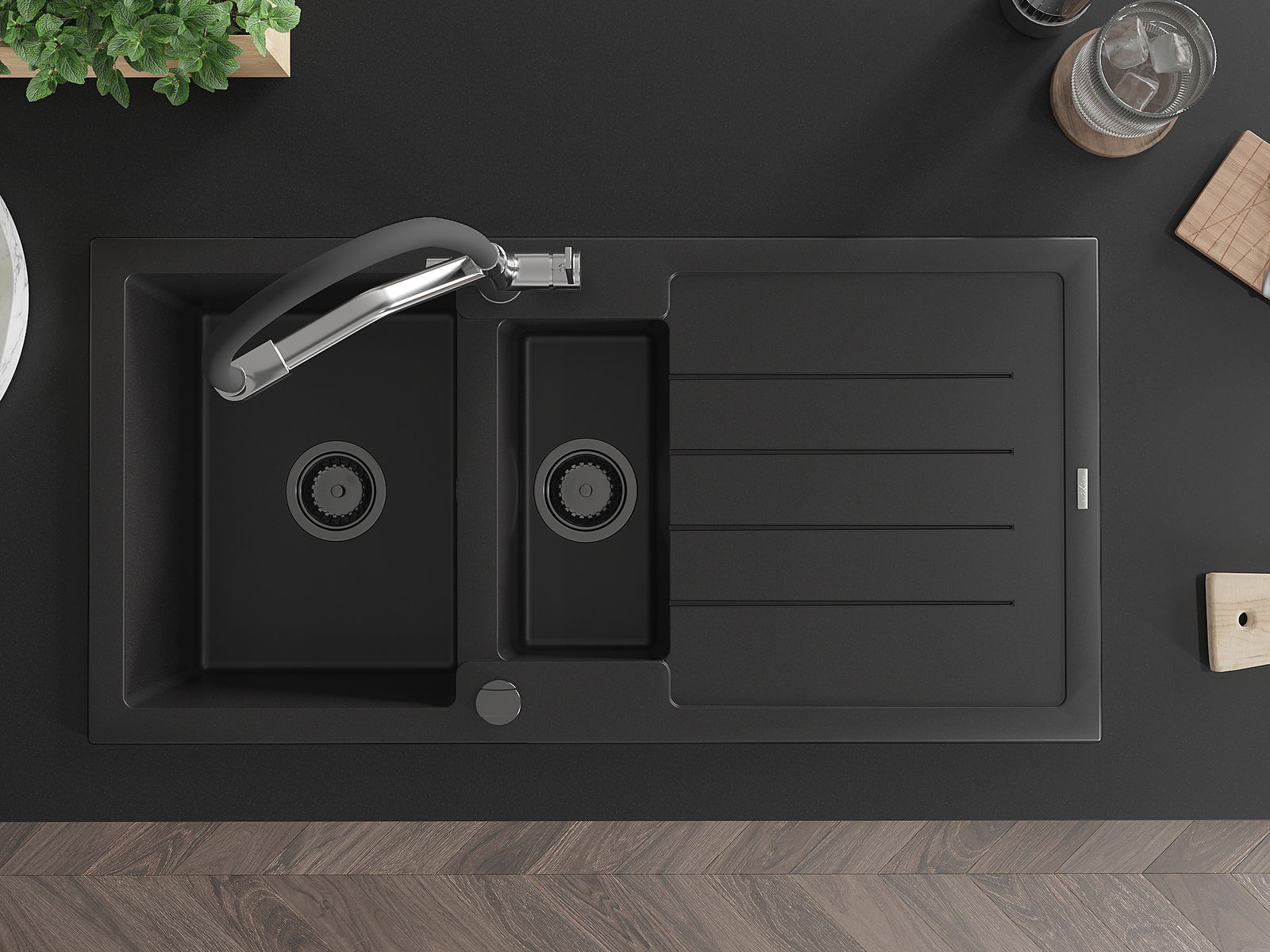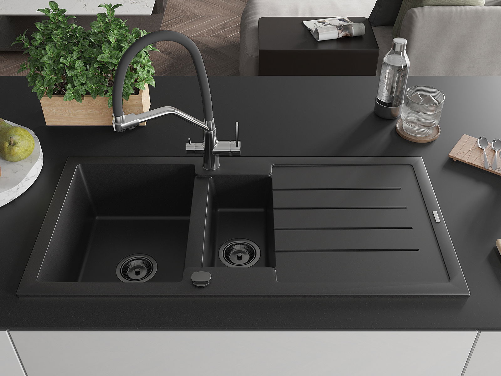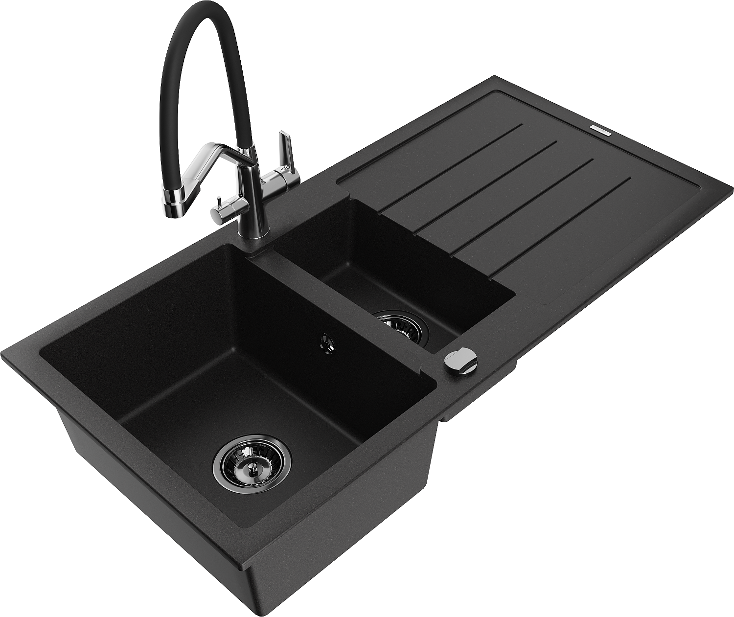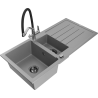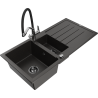 Mexen Andres granitizlietne izlietne ar 1,5 nodalījumu ar notekpaplāti un virtuves krānu Duo, melna - 6515-77-671701-07-B