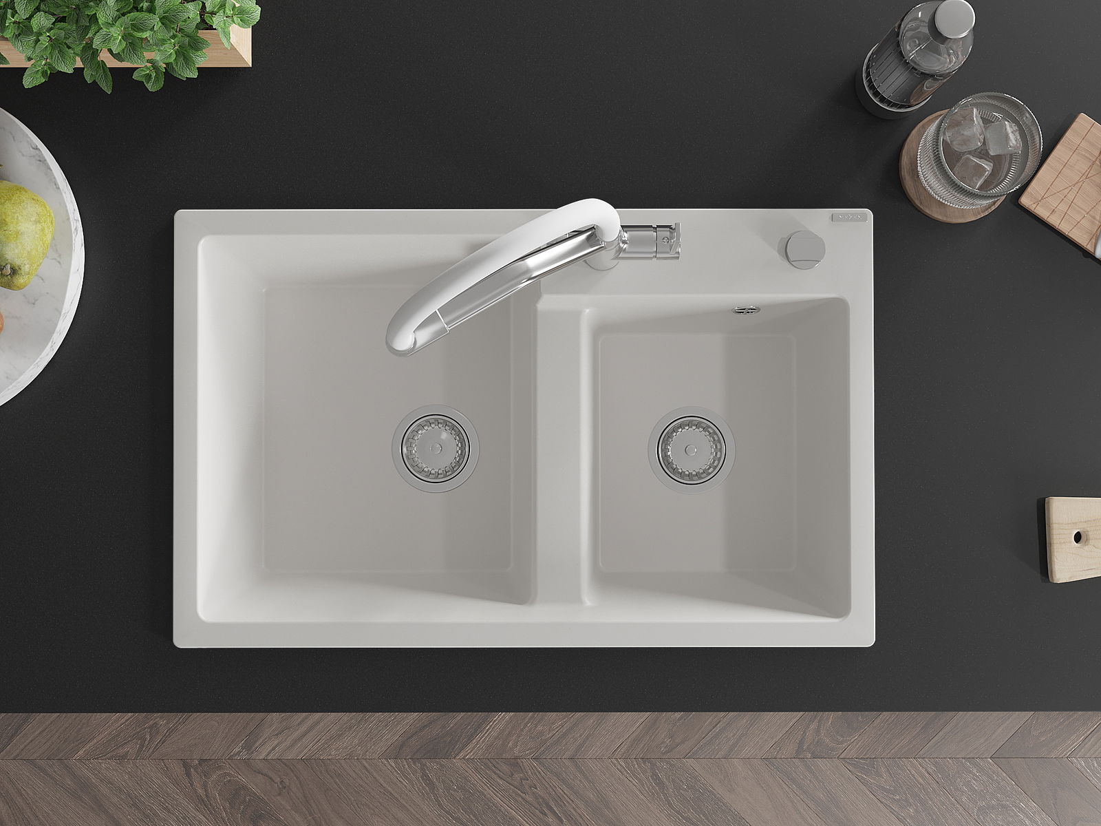 Mexen Tomas divpadsmit granītu izlietnes 2 kameru ar virtuves jaucējkrānu Duo, balts - 6516-20-671701-02