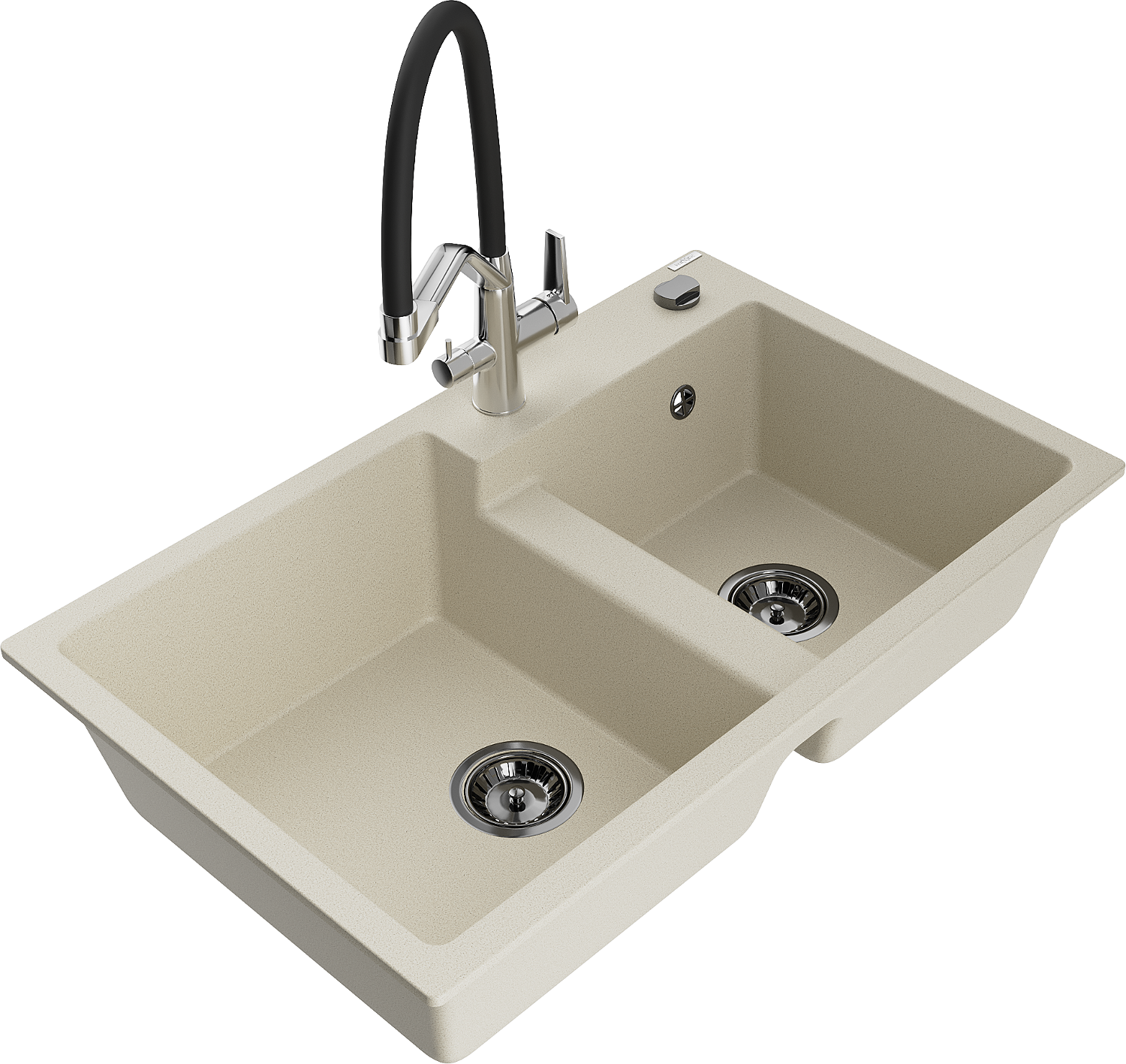 Mexen Tomas granitā izlietne ar divām nodalījumiem un virtuves jaucējkrānu Duo, bēša - 6516-69-671701-07-B