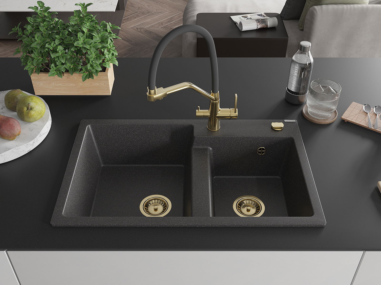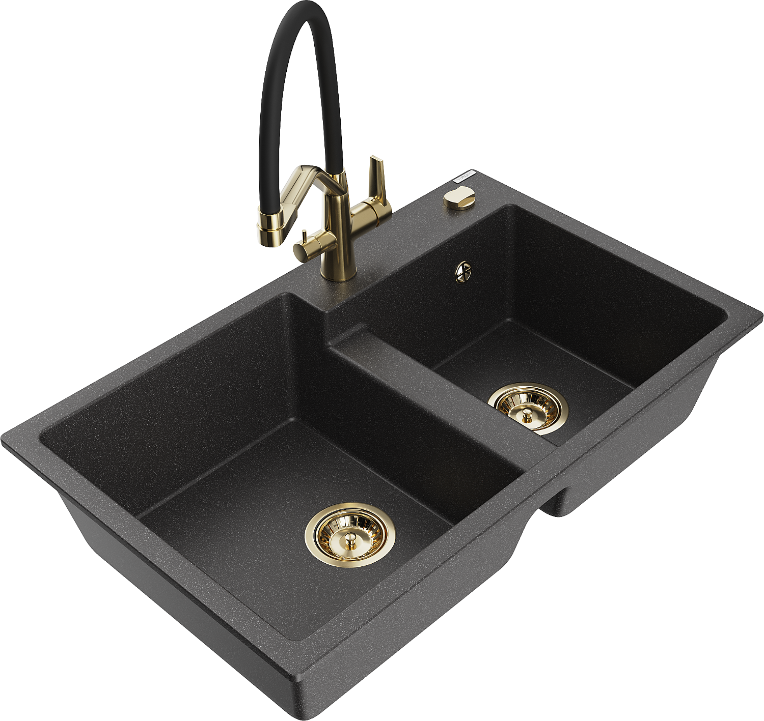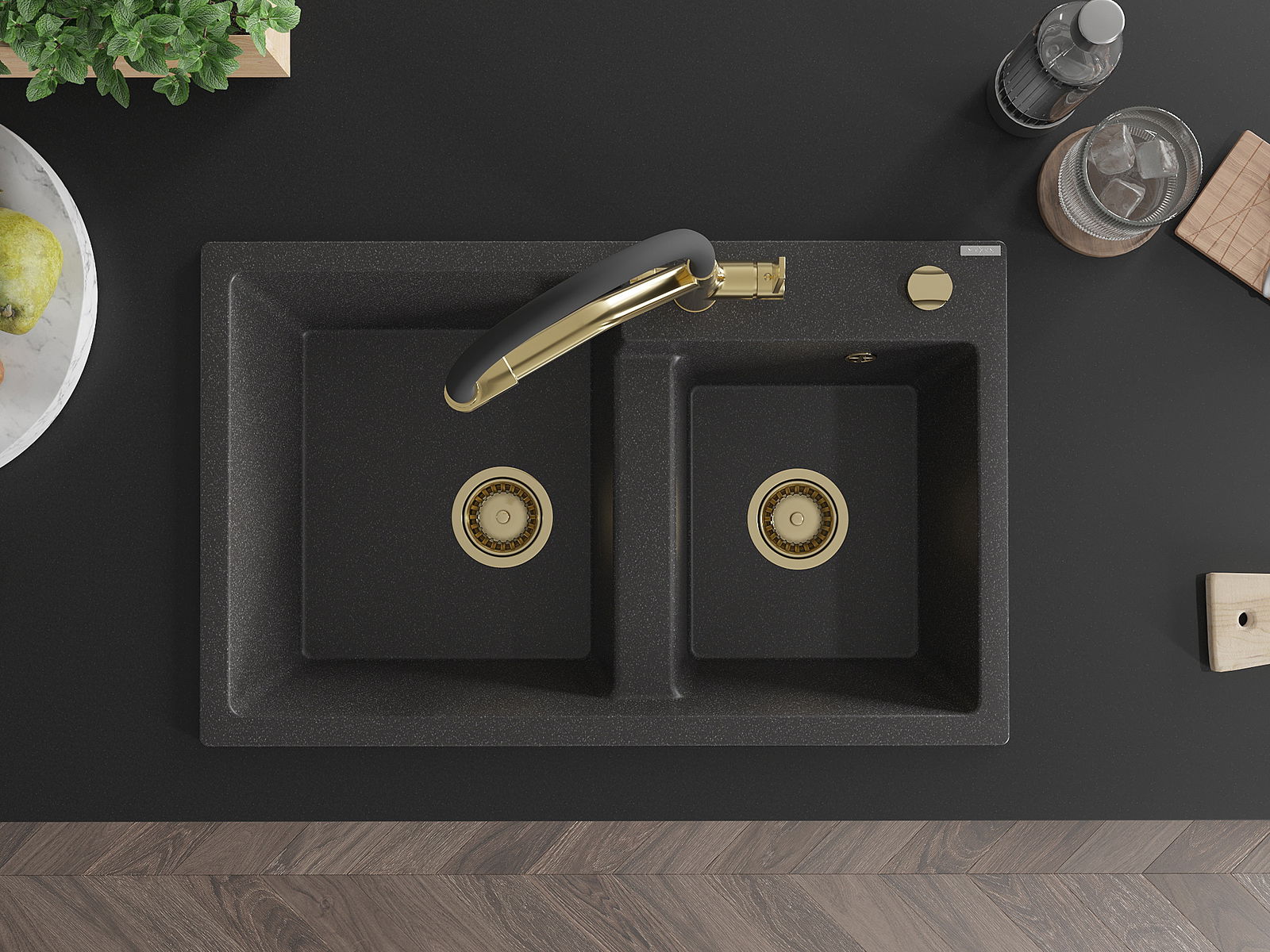 Mexen Tomas granitais izlietne ar 2 nodalījumiem ar virtuves jaucējkrānu Duo, melna ar punktiem - 6516-76-671701-57-G