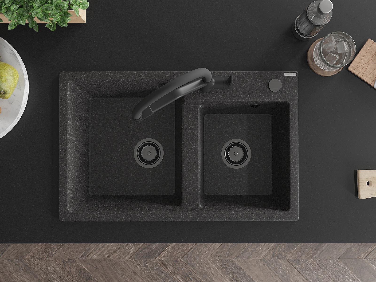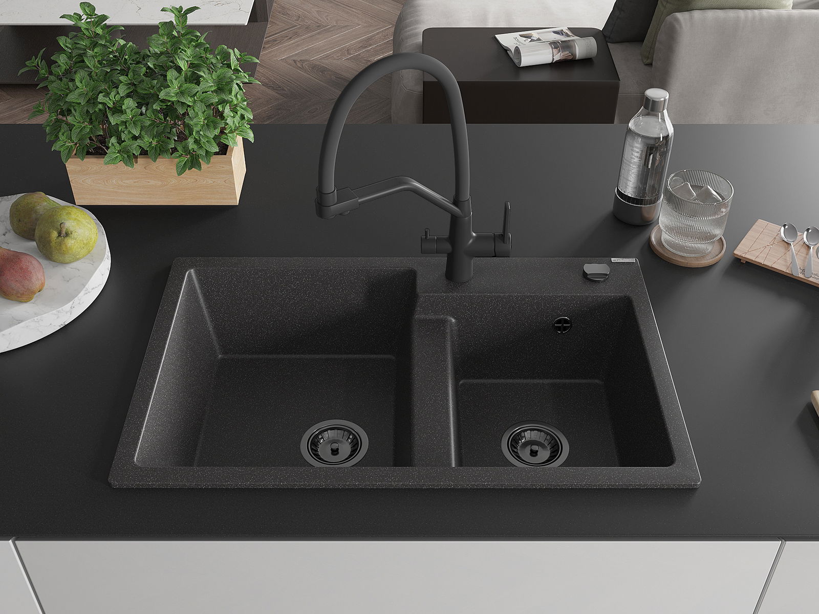 Mexen Tomas divpadsmitgades divstāvu granīta izlietne ar virtuves jaucējkrānu Duo, melns plankumains - 6516-76-671701-70-B