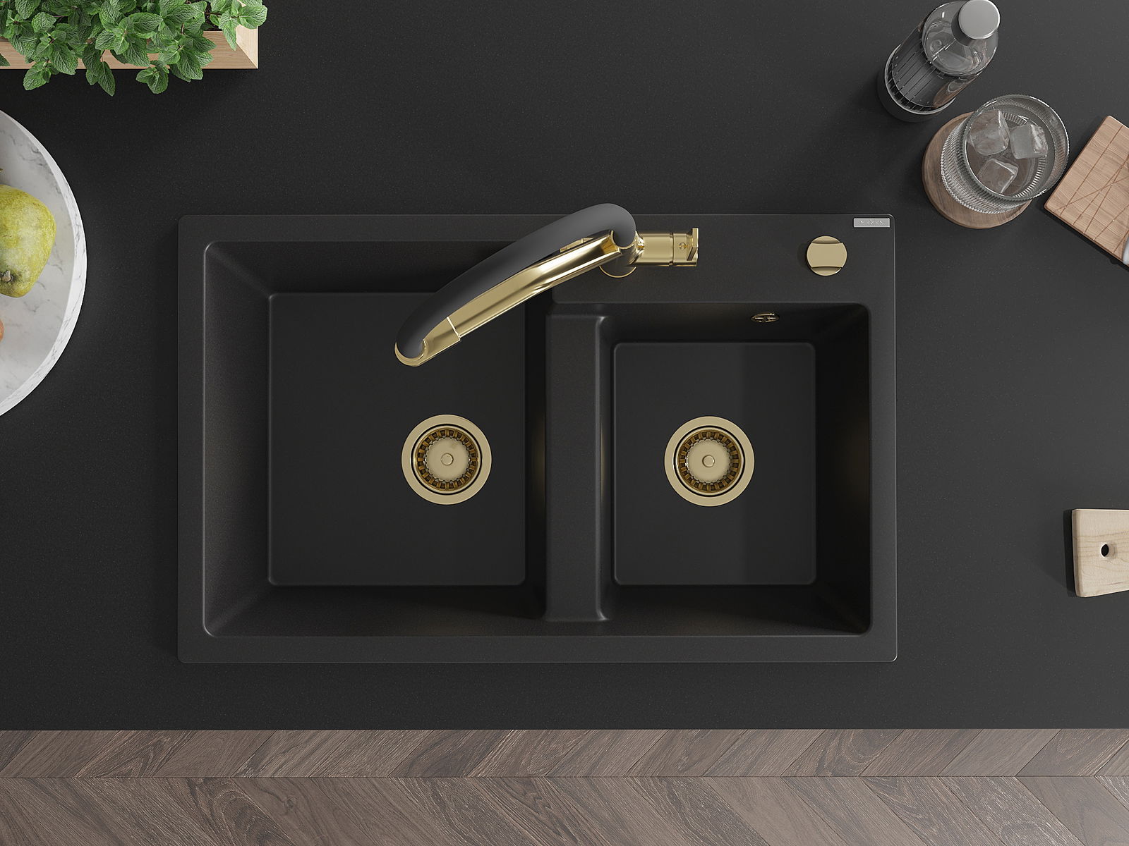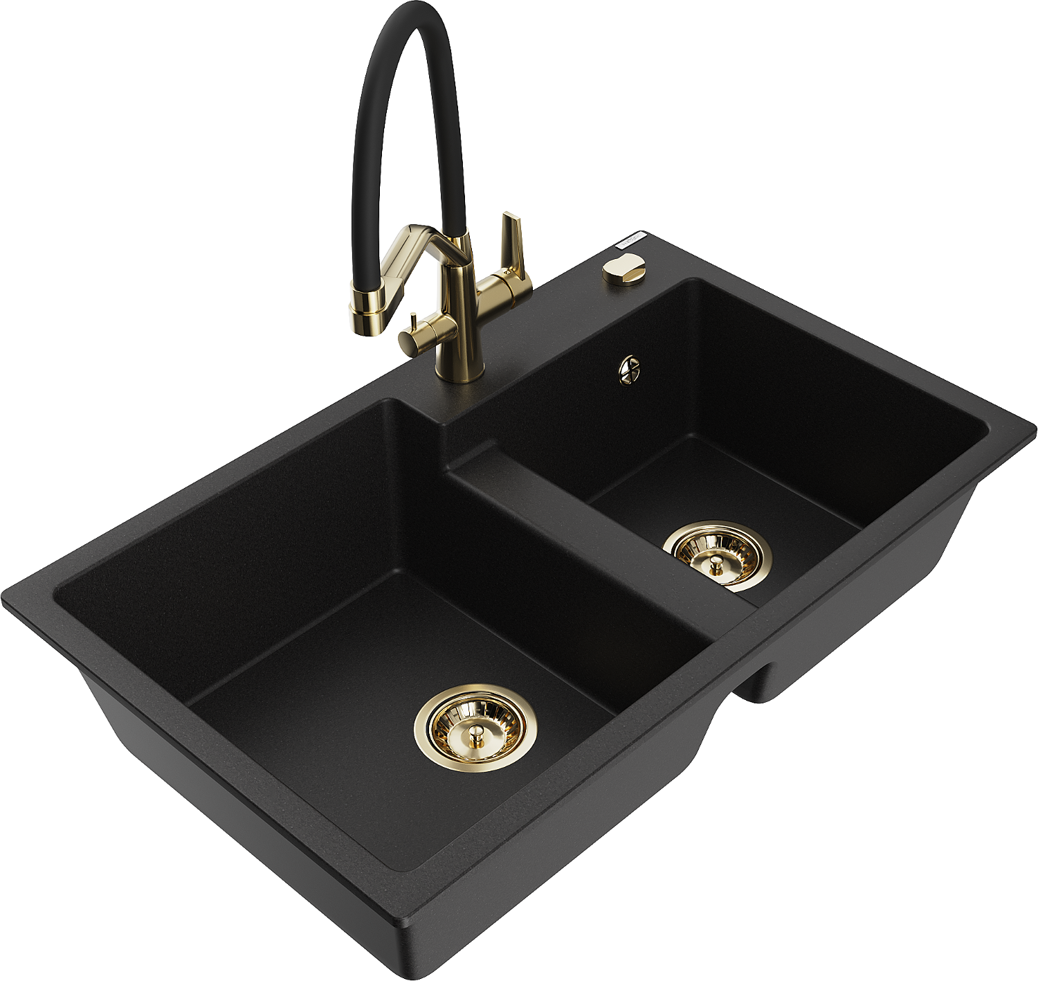 Mexen Tomas divpadsmit granīta izlietne ar divām nodalījumiem un virtuves krānu Duo, melna - 6516-77-671701-57-G
