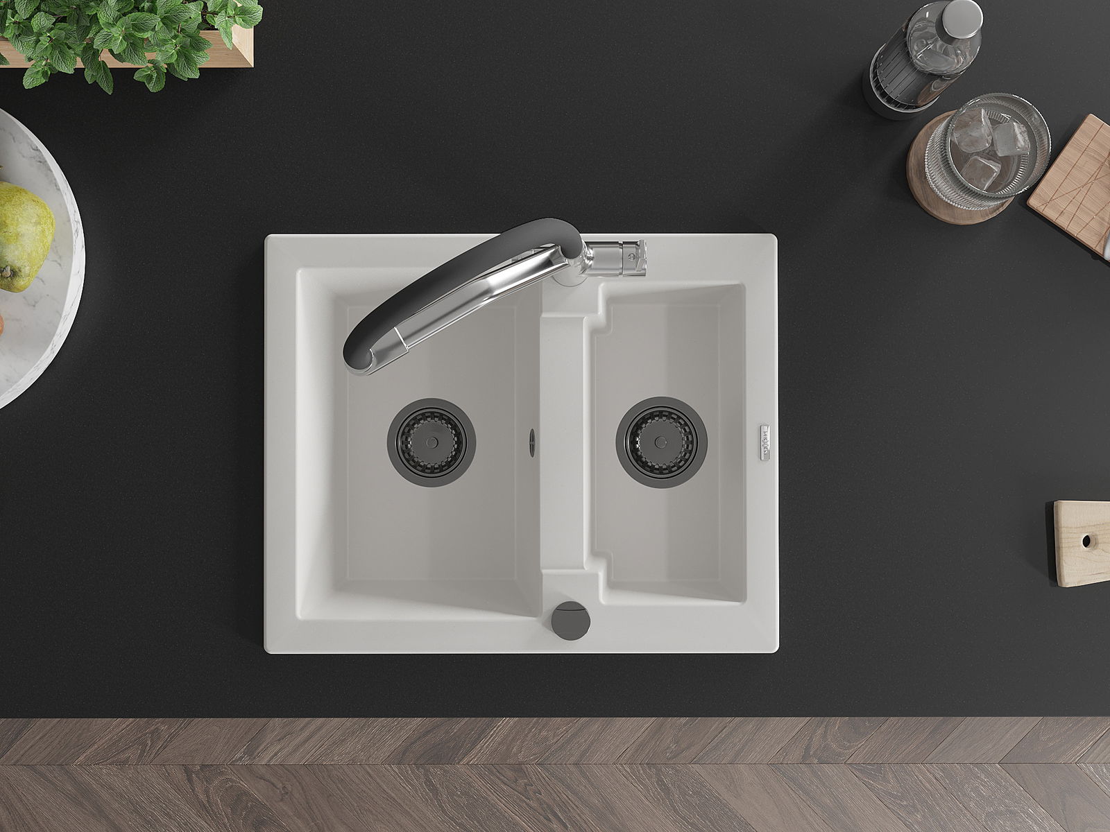 Mexen Carlos Granitizlietne izlietne ar 1,5 nodalījumiem un virtuves jaucējkrāns Duo, balts - 6518-20-671701-07-B