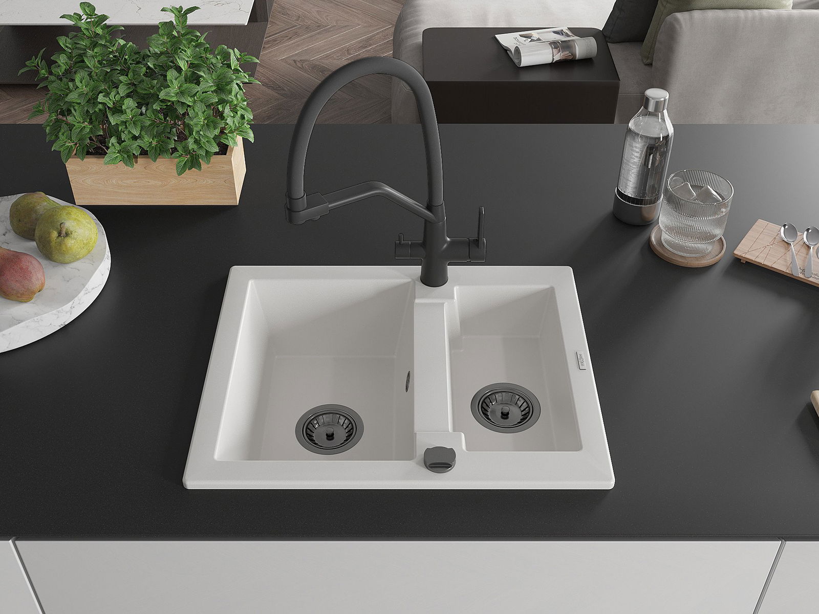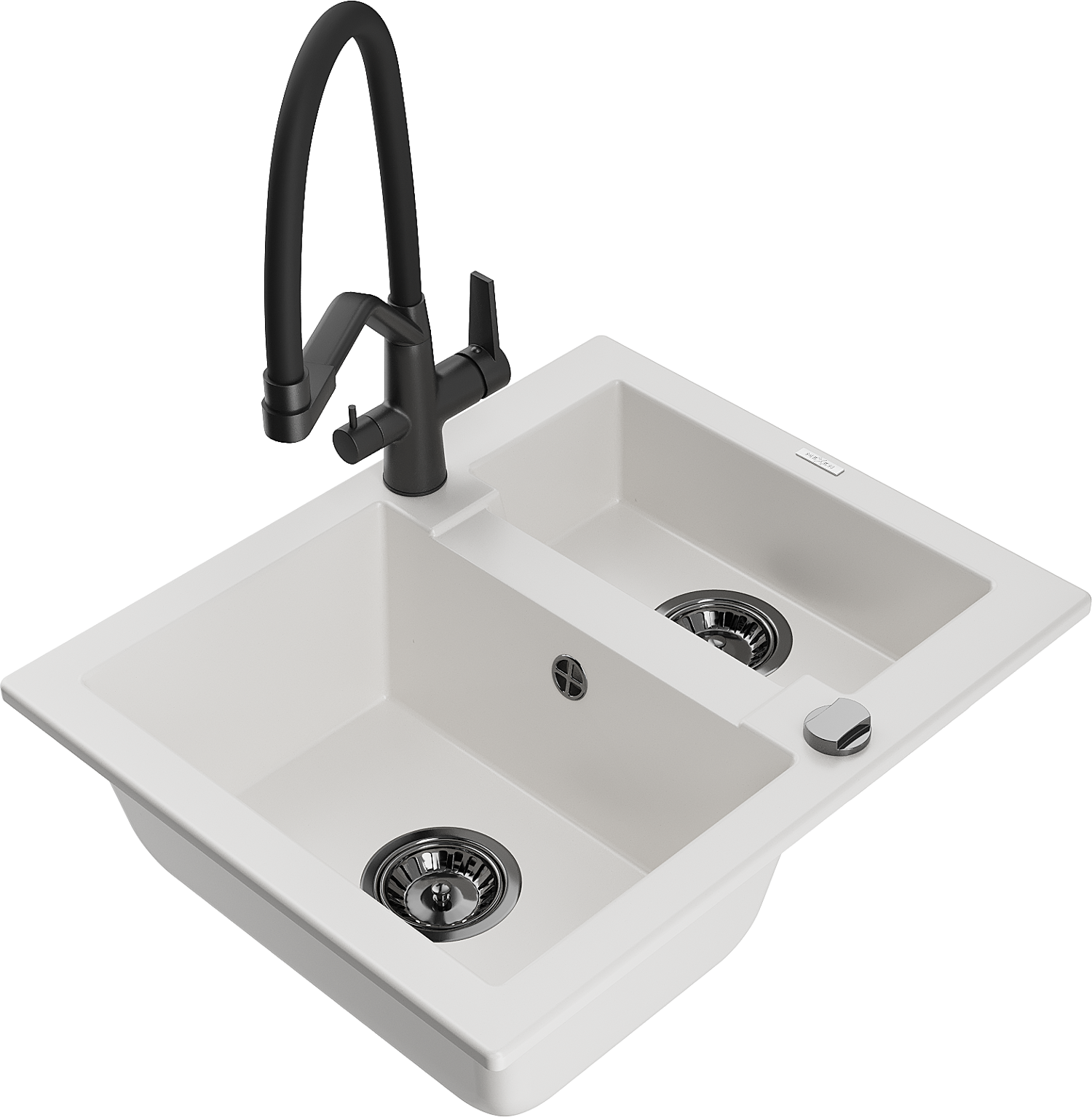 Mexen Carlos granīta izlietne ar 1,5 nodalījumiem un virtuves jaucējkrānu Duo, balta - 6518-20-671701-70-B